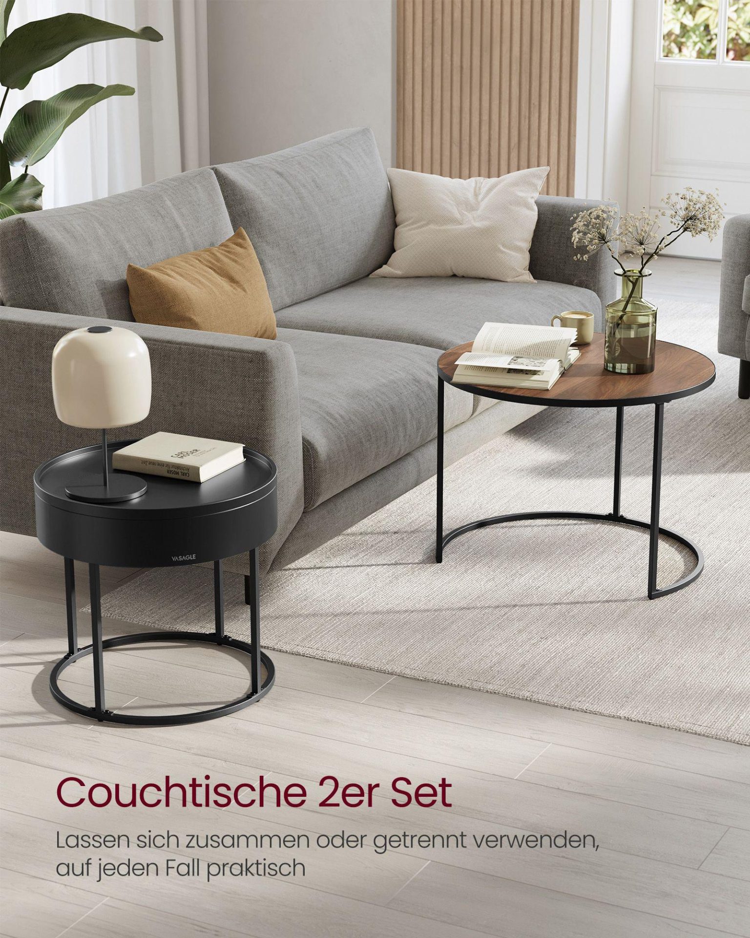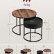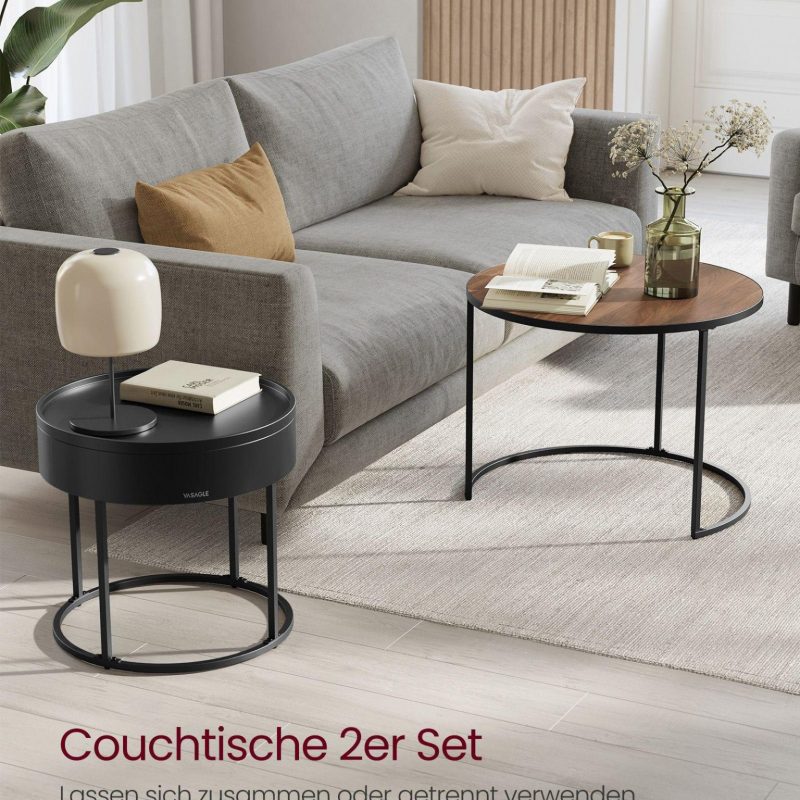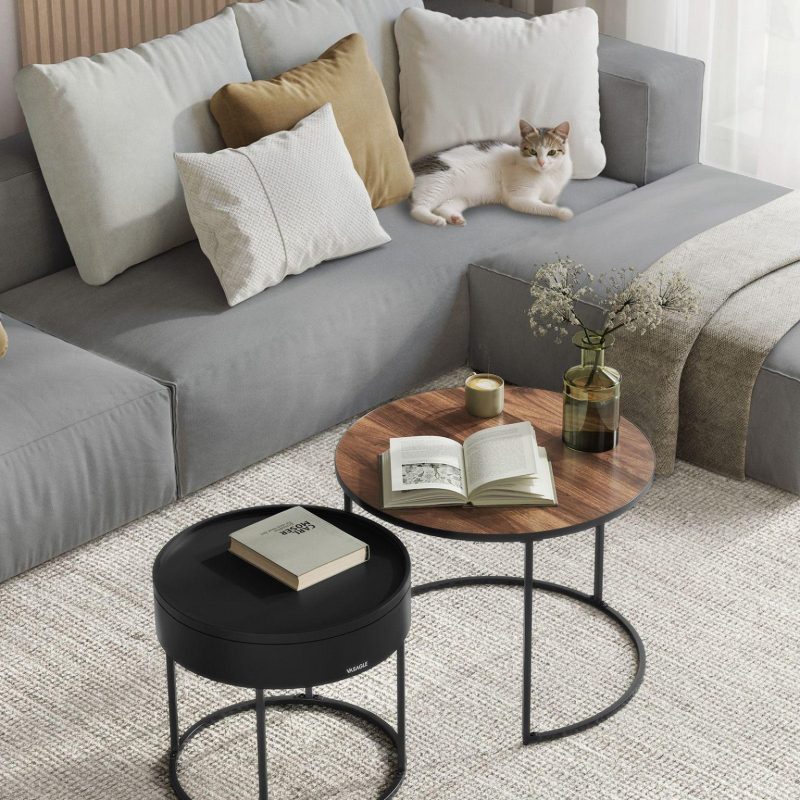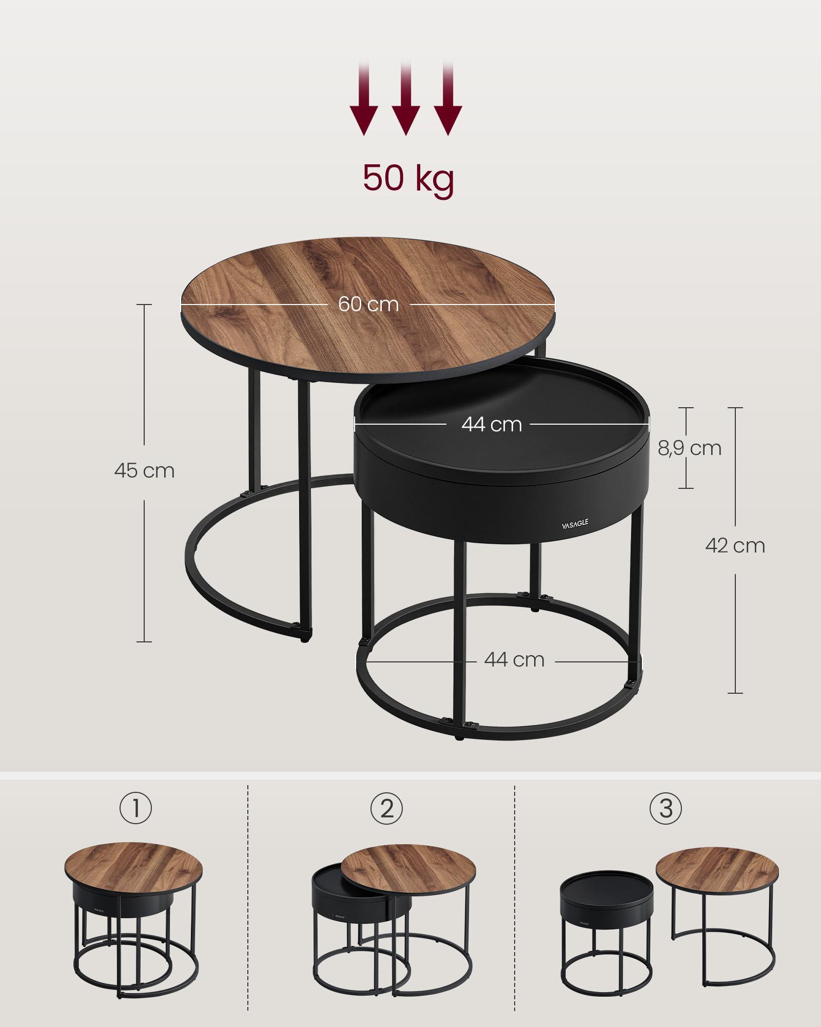 Ümar kaheosaline kohvilaudade komplekt, peidetud hoiuruumiga, naturaalne pähklipuu ja tintimust