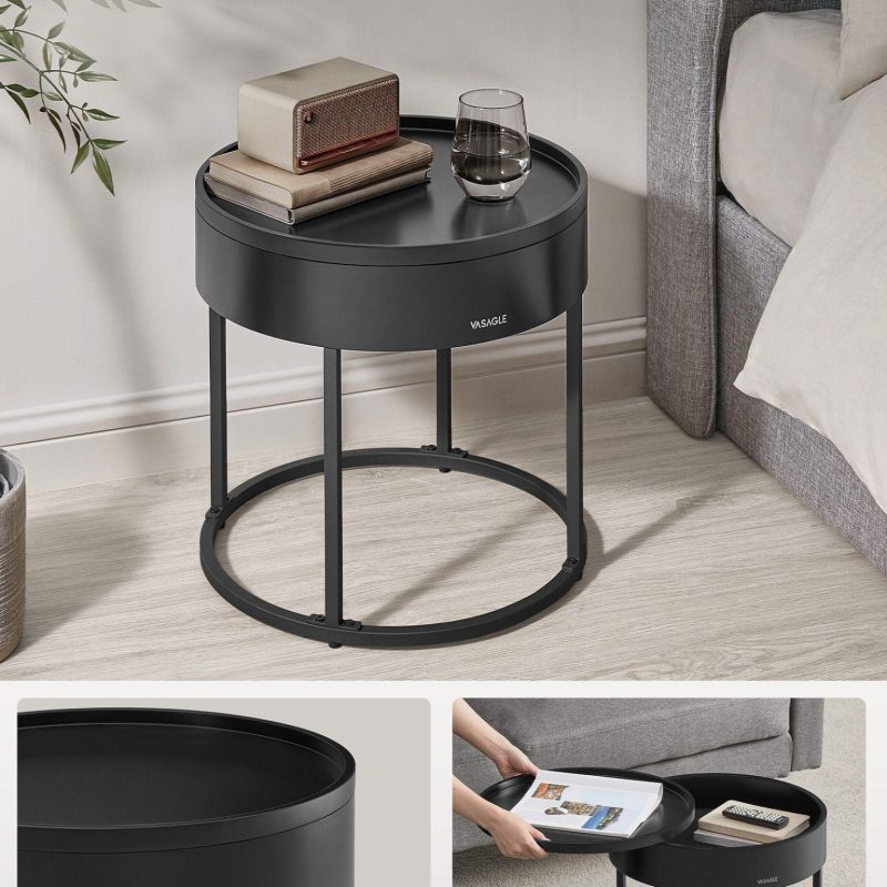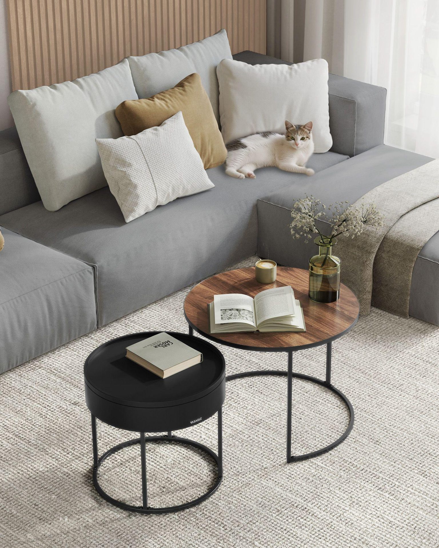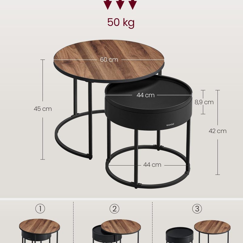 See kaasaegne ja praktiline kohvilaudade komplekt sobib suurepäraselt elutuppa, magamistuppa või rõdule. Laudade disain sisaldab peidetud hoiuruumi ja eemaldatavat kandikut, pakkudes nutikat lahendust igapäevaste esemete hoidmiseks. Naturaalne pähklipuu viimistlus koos tintimusta terasraamiga loob stiilse ja ajatu välimuse.