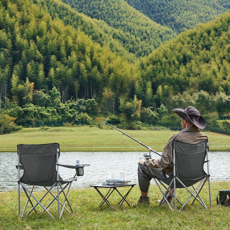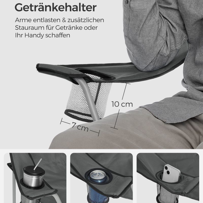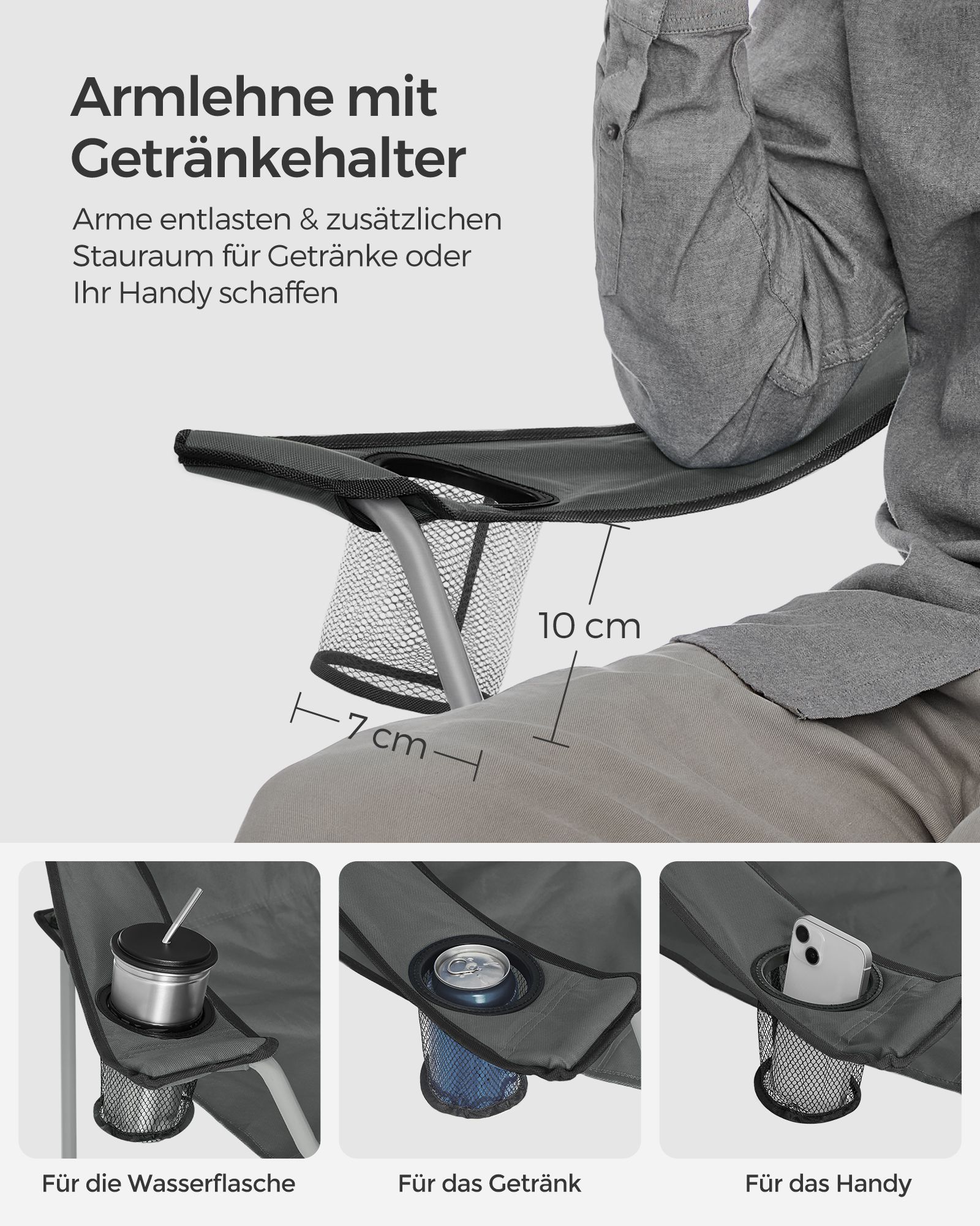 Täiustage oma õueelamust telkimistoolidega, mugava komplektiga, kuhu kuulub 2 kokkuklapitavat tooli koos käetugede ja joogihoidjaga. Valmistatud vastupidavast terasest ja Oxfordi kangast, mõõdab iga tool avatuna 52 x 84 x 81 cm ja kokkupandult 14 x 86 x 14 cm. Istme mõõtmed on 42 x 40 cm, seljatoe kõrgus on 48 cm ja istme-kõrgus-maapinnast on 43 cm. Kaaludes igaüks 2,3 kg, mahutavad need toolid kuni 120 kg.