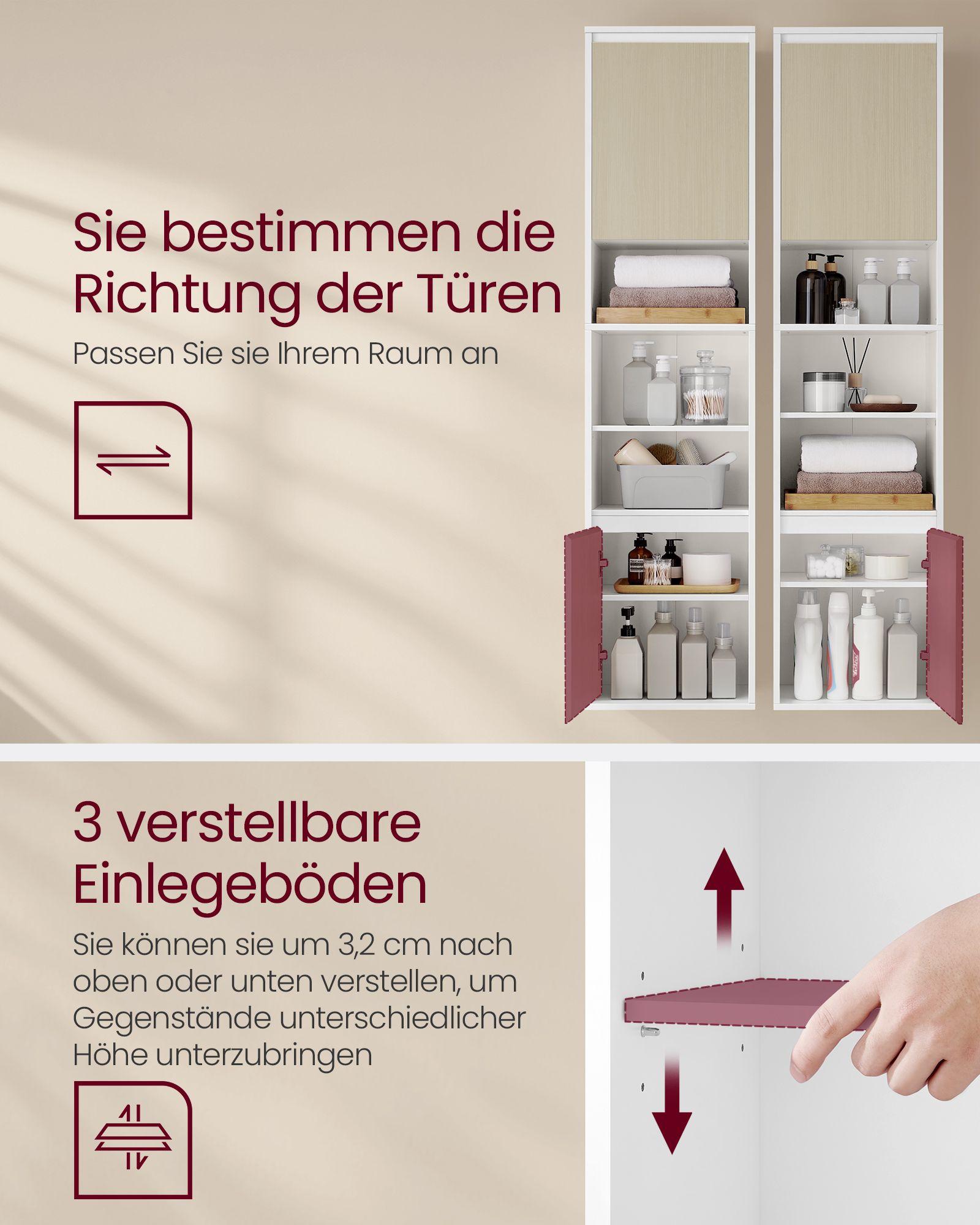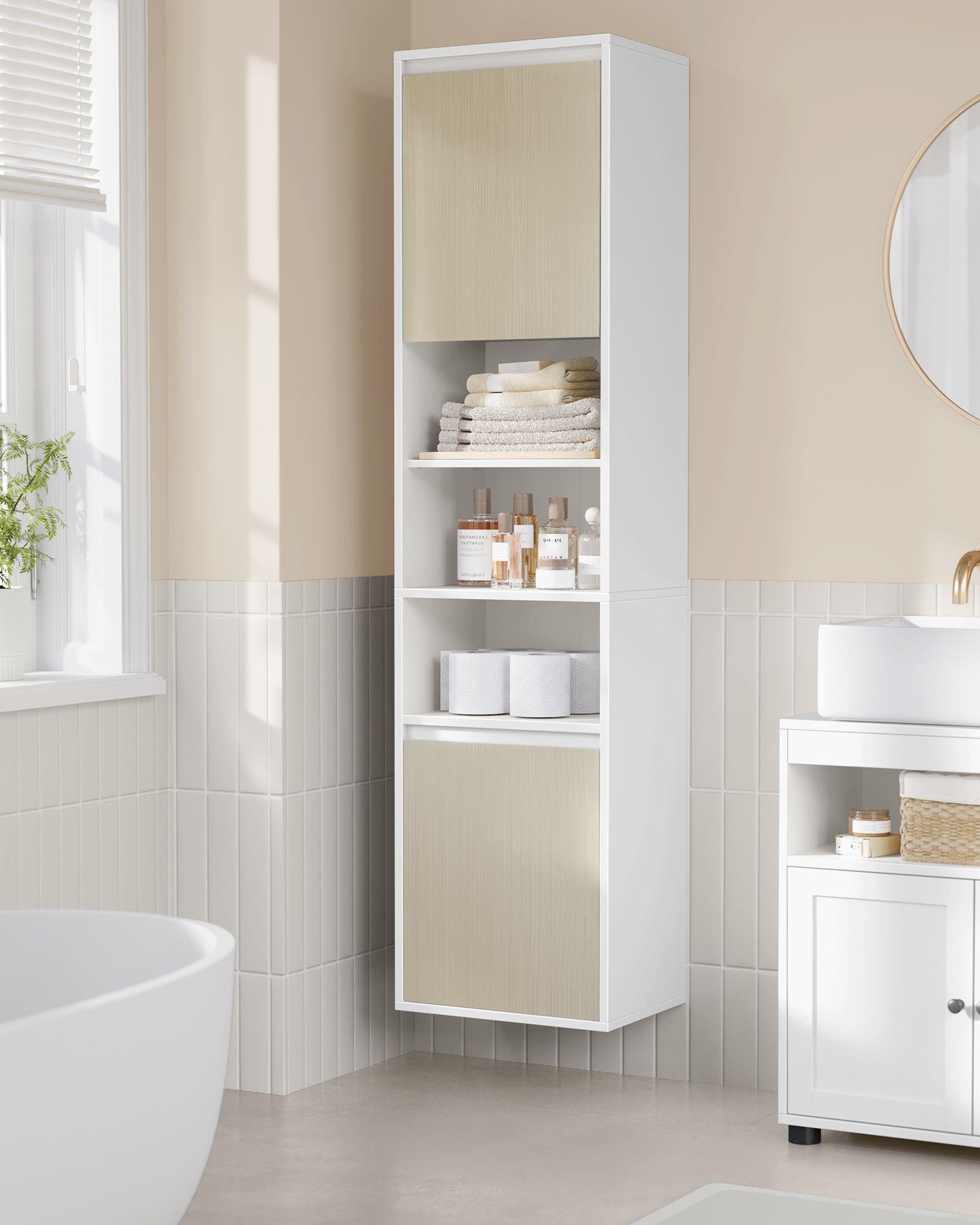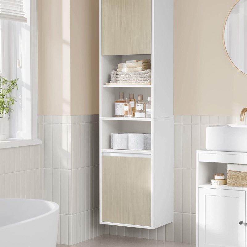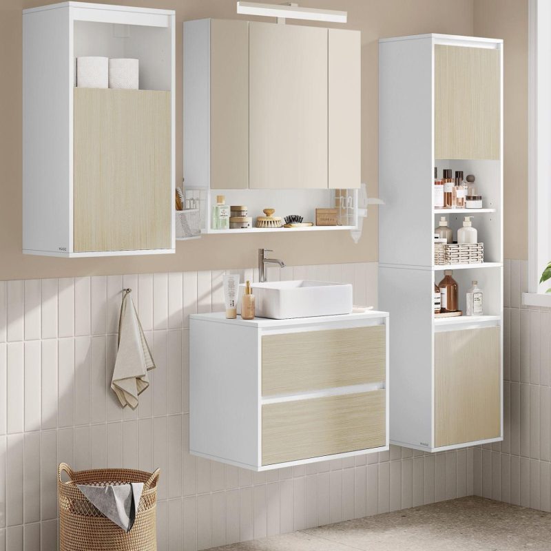 Kõrge rippuv vannitoakapp, reguleeritava ukse avamissuunaga, pilvevalge ja naturaalbeež