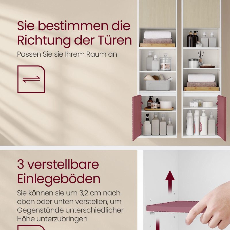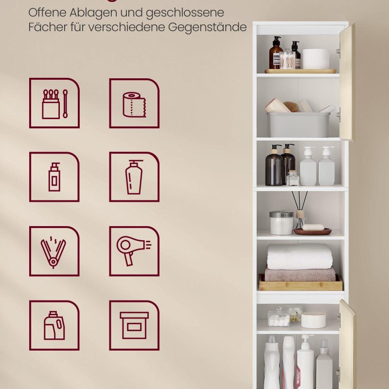 See stiilne ja ruumikas kõrge vannitoakapp sobib suurepäraselt vannituppa täiendava hoiuruumi loomiseks. Kapp on varustatud seitsme riiuliga, sealhulgas kolme reguleeritava kõrgusega riiuliga, pakkudes paindlikku ja praktilist lahendust. Ukse avamissuunda saab reguleerida vastavalt vajadusele, et kapp sobituks igasuguse paigutusega.