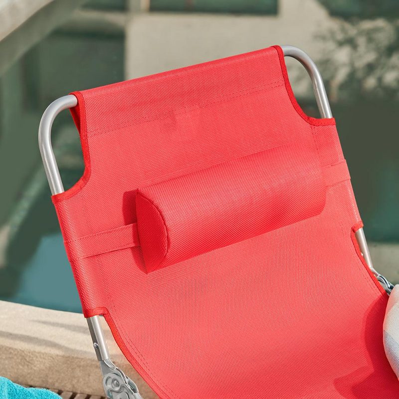 Lamamistoolid 2tk punased on valmistatud vastupidavast, ilmastikukindlast hallist materjalist, sellel on funktsionaalne peatugi ja vastupidav must kiht kumeratel käetugedel ja suuskadel.