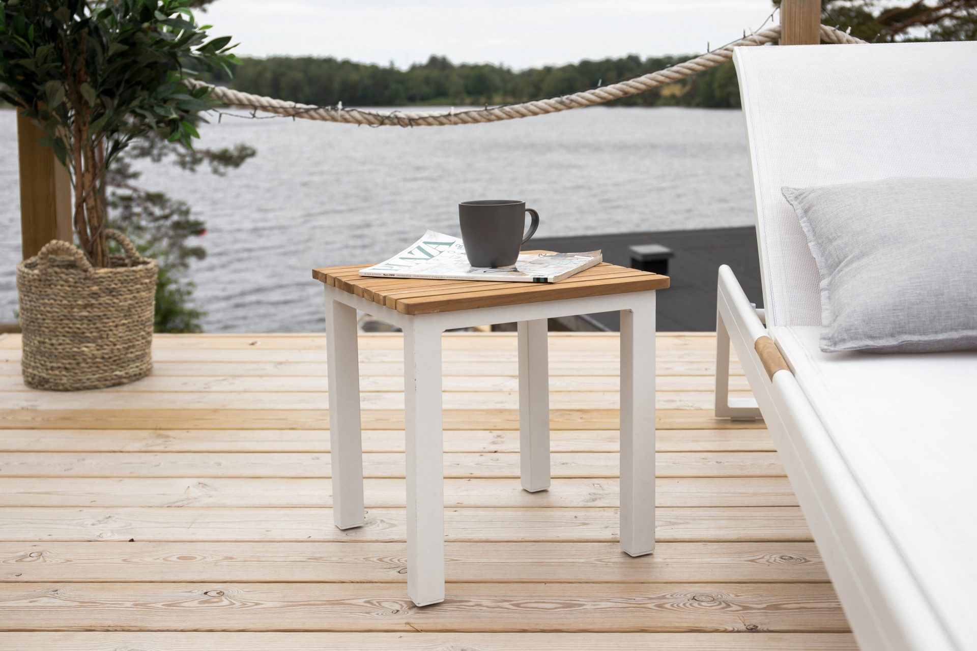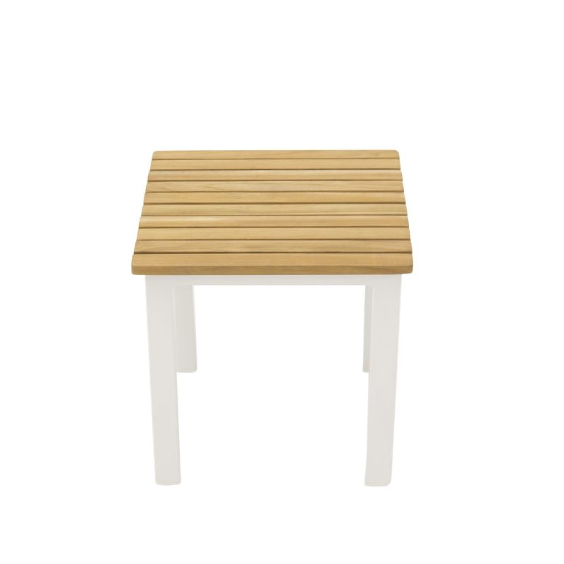 Valmistatud valgetest alumiiniumjalgadest stabiilsuse ja modernse välimuse tagamiseks ning tiigipuust lauaplaadist naturaalse ja sooja puudutuse andmiseks, on see laud ideaalne, et hoida oma asju käeulatuses.