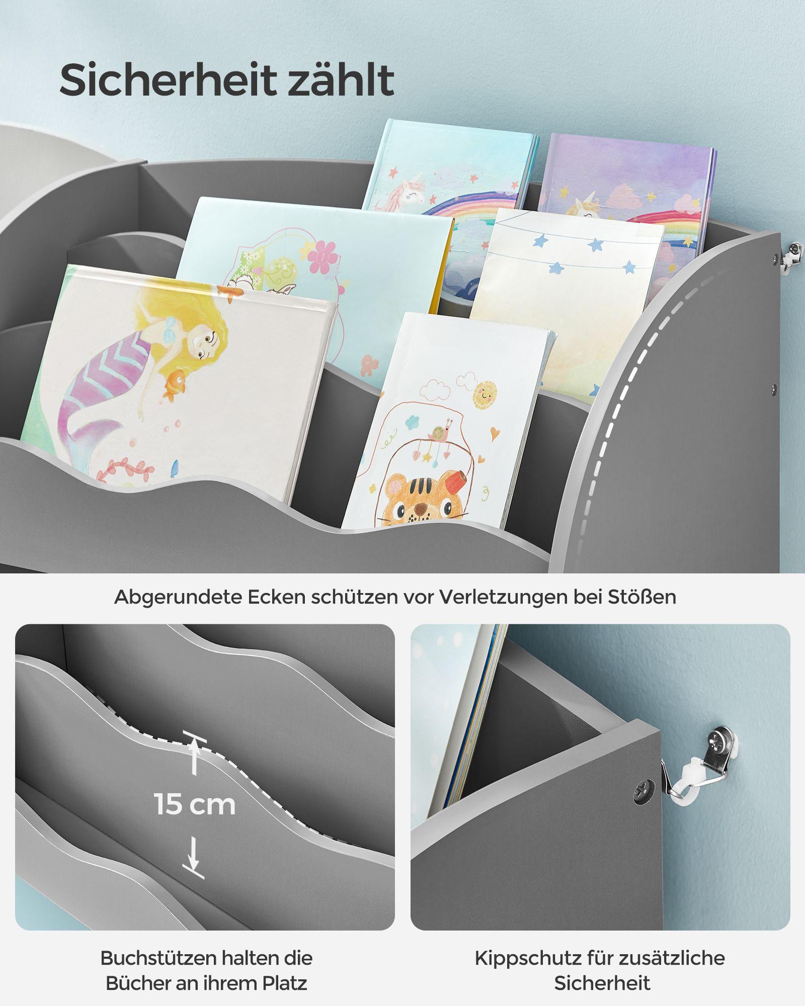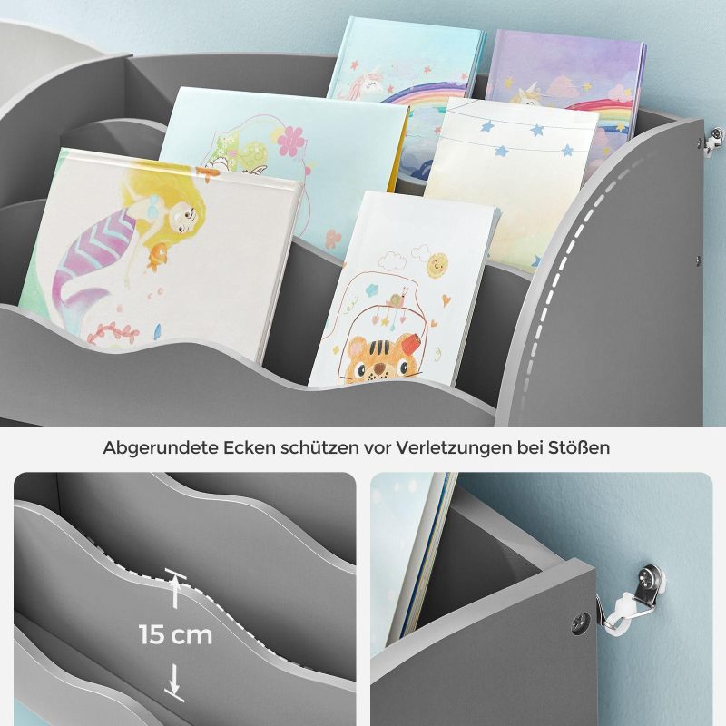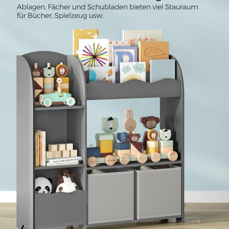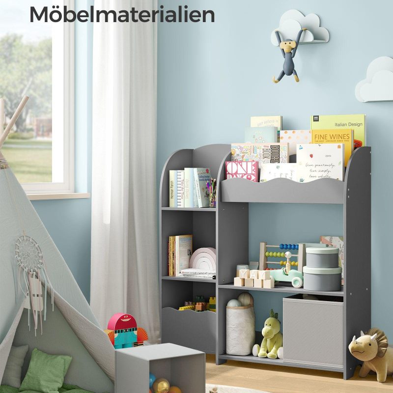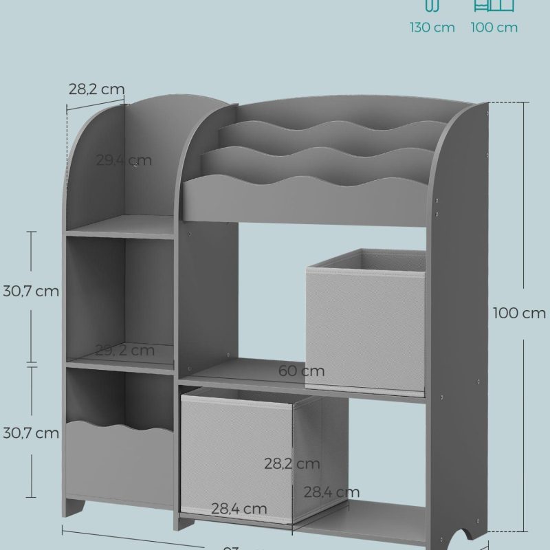 Mänguasjade riiul 30x93x100cm pruun tumehall üksikasjad stiilse ja mitmekülgse laste raamaturiiuli kohta, mis sobib suurepäraselt raamatute, mänguasjade ja muude esemete hoidmiseks lastetoas, mängutoas või elutoas: