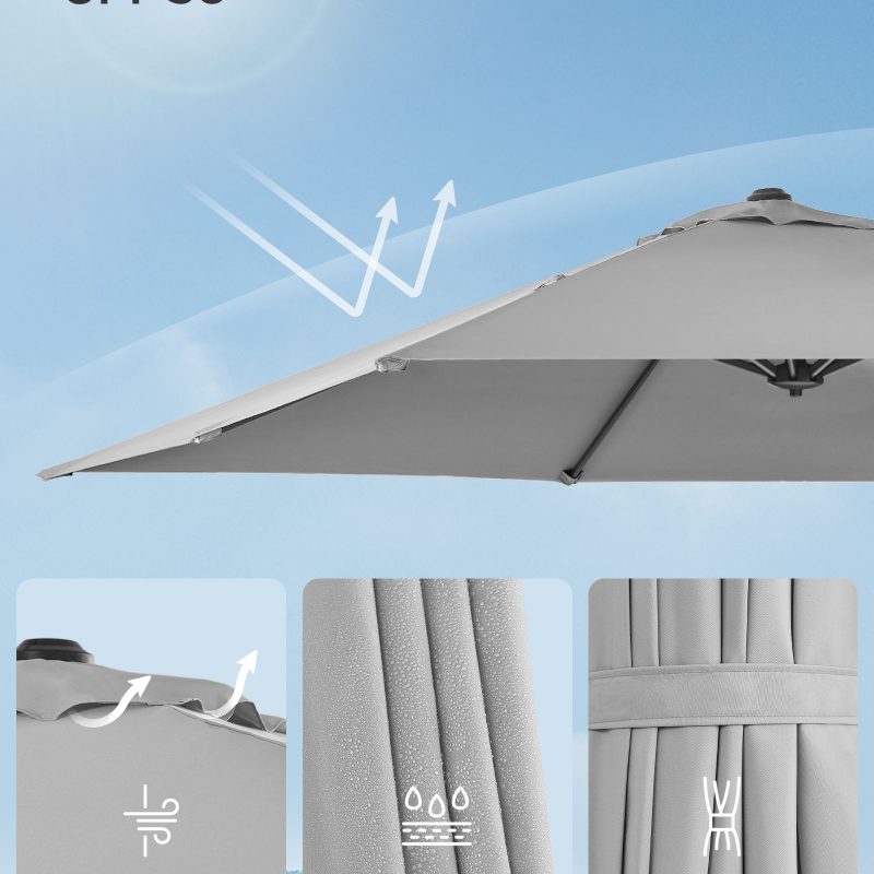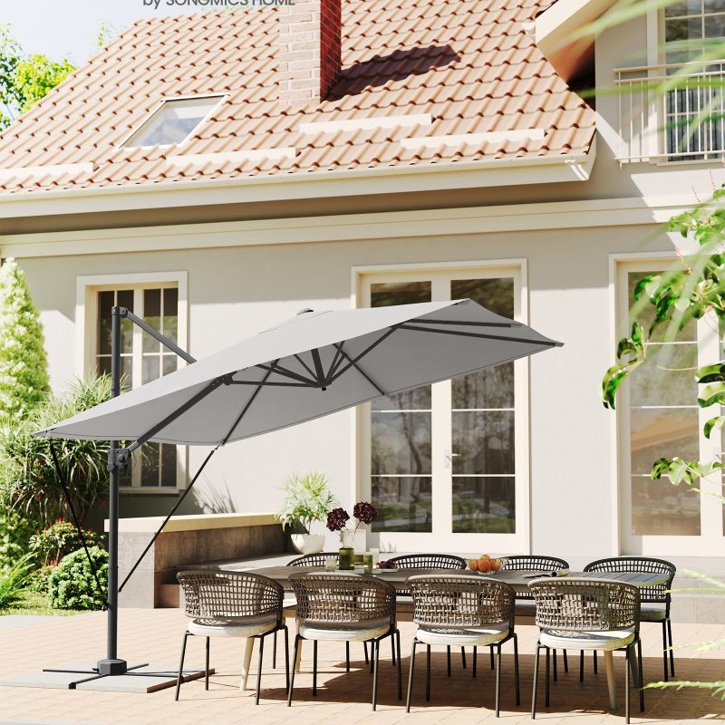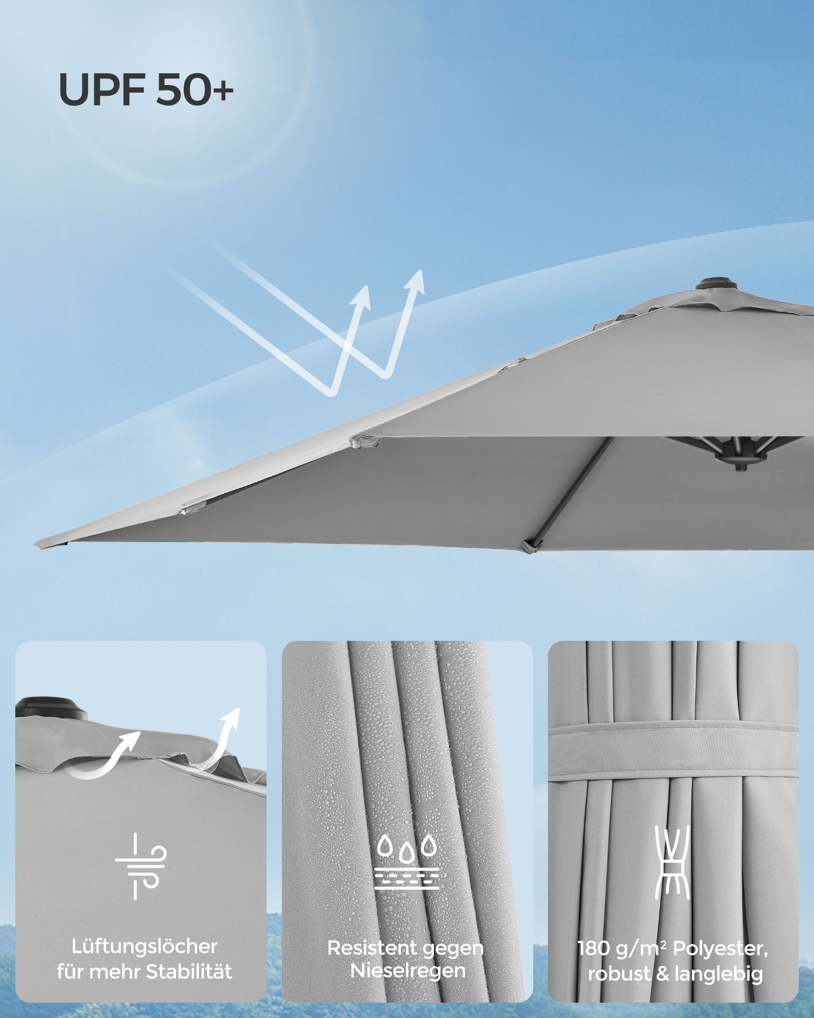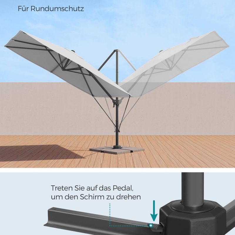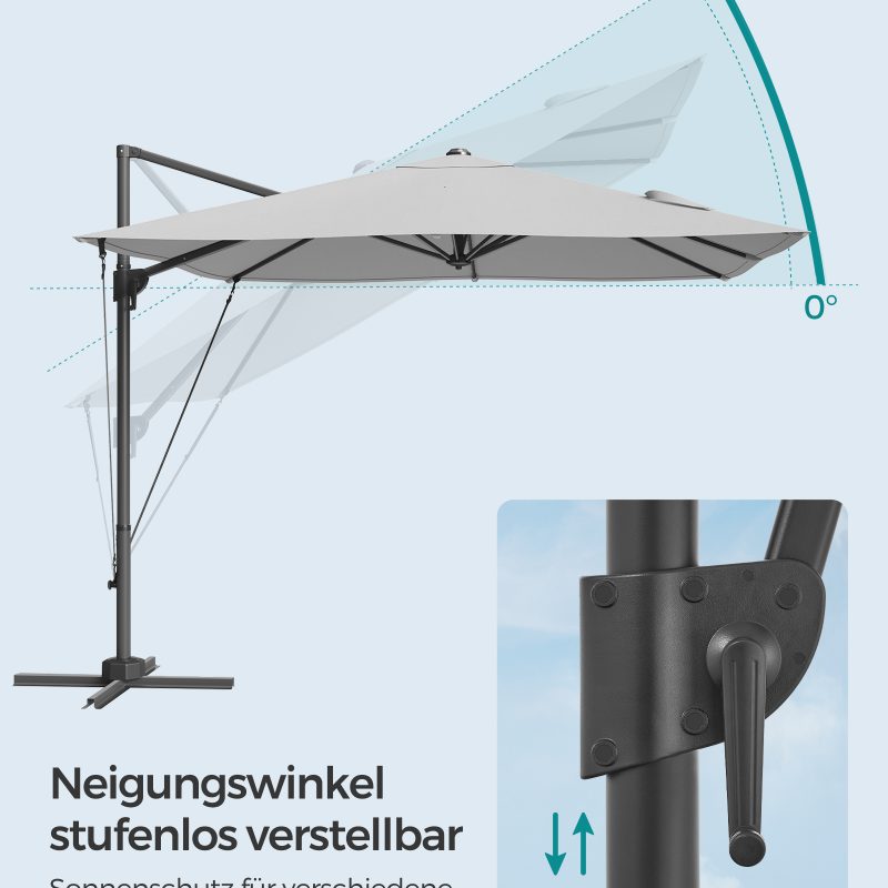 Naudi stiilset varju oma aias Cantilever päikesevarjuga. See elegantne päikesevari on suurusega 270 x 270 cm ning pakub UPF 50+ UV-kaitset. See võib pöörelda 360° ja sellel on reguleeritav kaldenurk optimaalseks katvuseks. Valmistatud vastupidavast terasest ja 180 g/m² polüestrist, kõrgusel 240 cm ning kaalub 17.4 kg.