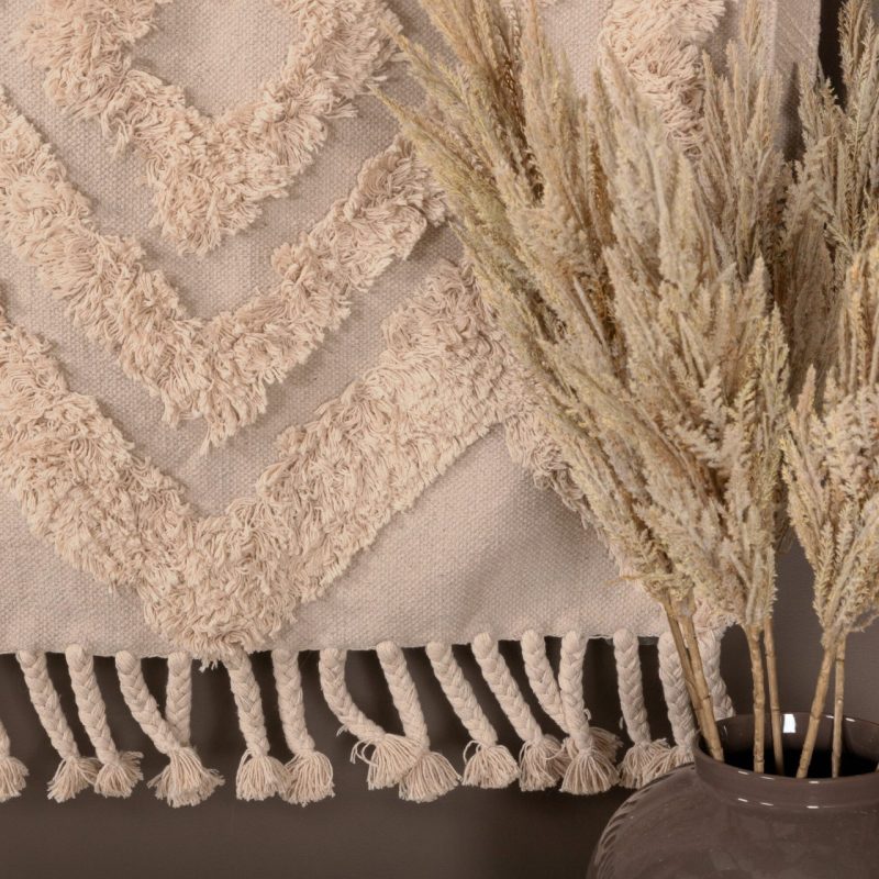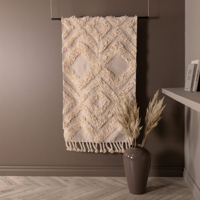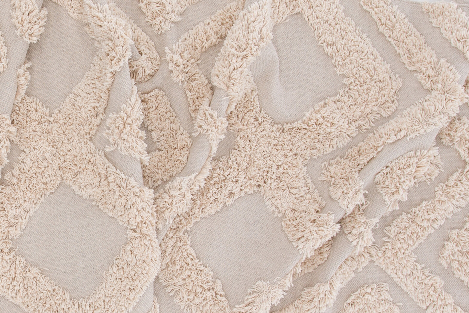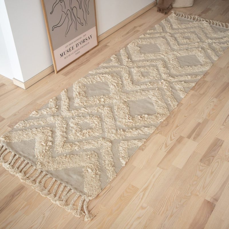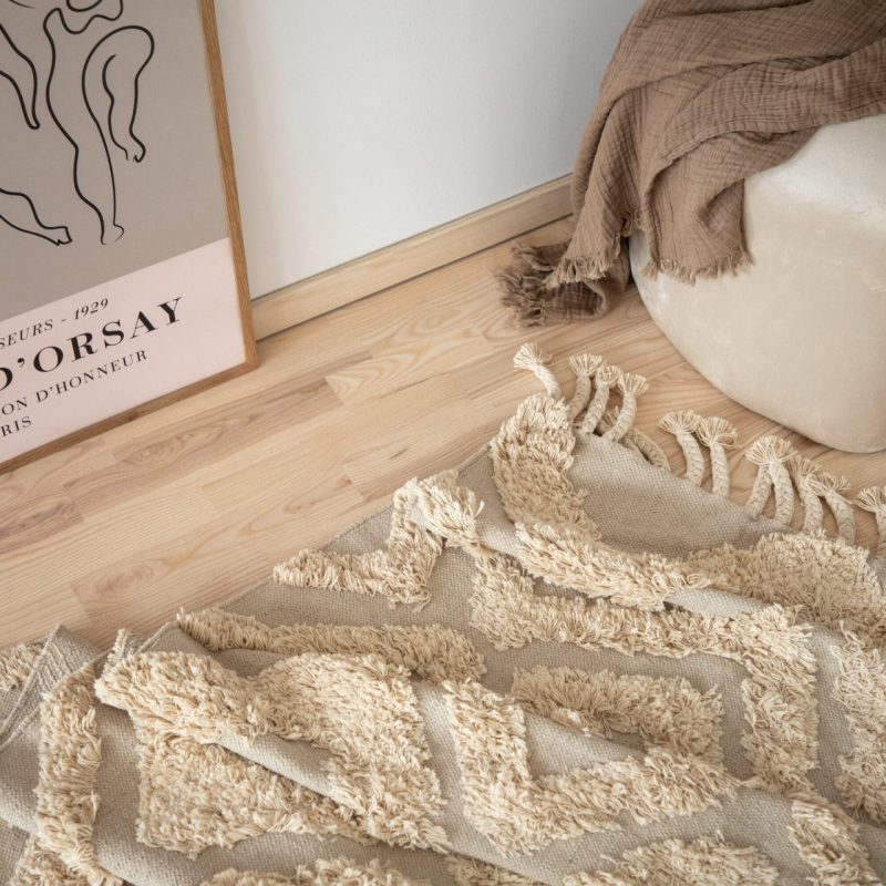 Tutvustame Hilma puuvillast valmistatud ristkülikukujulist elevandiluu värvi vaipa! Hilma on trendikas ristkülikukujuline vaip, mis on valmistatud maalähedastest toonidest puuvillast, millel on siksakilised narmad. See loodusliku värvusega matt lisab teie toa sisustusele lisapuudutuse.