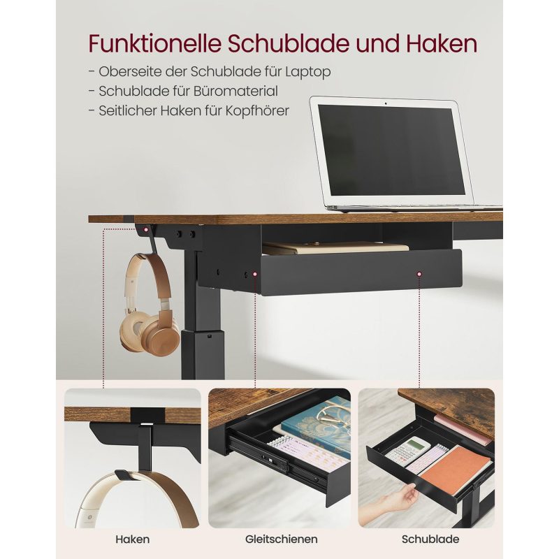 Elektriliselt kõrguse reguleeritav kirjutuslaud, pistikupesa ja sahtliga, 60 x 140 cm lauapind, astmeteta reguleeritav, mälufunktsiooniga 4 kõrguse jaoks