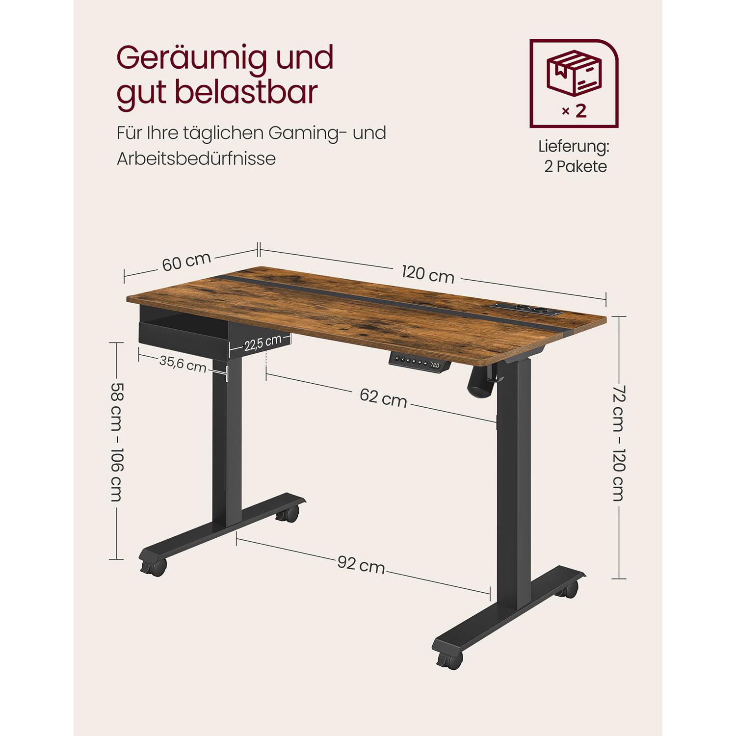 Reguleeritav kirjutuslaud 60 x 120 cm pruun kirjeldus: See elektriliselt kõrguse reguleeritav kirjutuslaud pakub mugavust ja paindlikkust, et kohandada oma tööruumi vastavalt vajadustele. Laual on sisseehitatud pistikupesa ja sahtel, mis tagavad lisafunktsionaalsuse ja hoiuruumi, hoides teie tööpinna korras ja organiseerituna. Mälufunktsioon võimaldab salvestada kuni neli erinevat kõrgusasetust, pakkudes kiiret ja mugavat üleminekut istuva ja seisva tööasendi vahel. Vintagepruuni ja musta värvi kombinatsioon lisab teie tööruumile stiili ja elegantsi. See laud sobib suurepäraselt igasse kontorisse või kodusesse tööruumi, muutes selle stiilseks ja praktiliseks valikuks.
