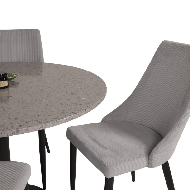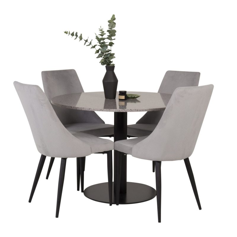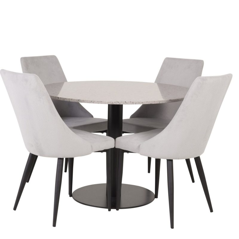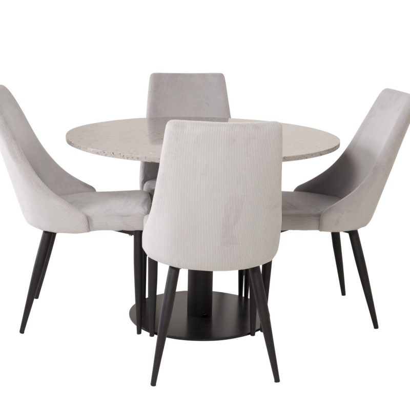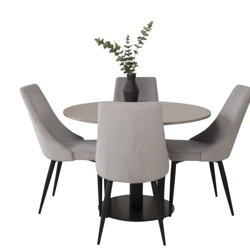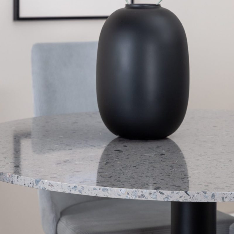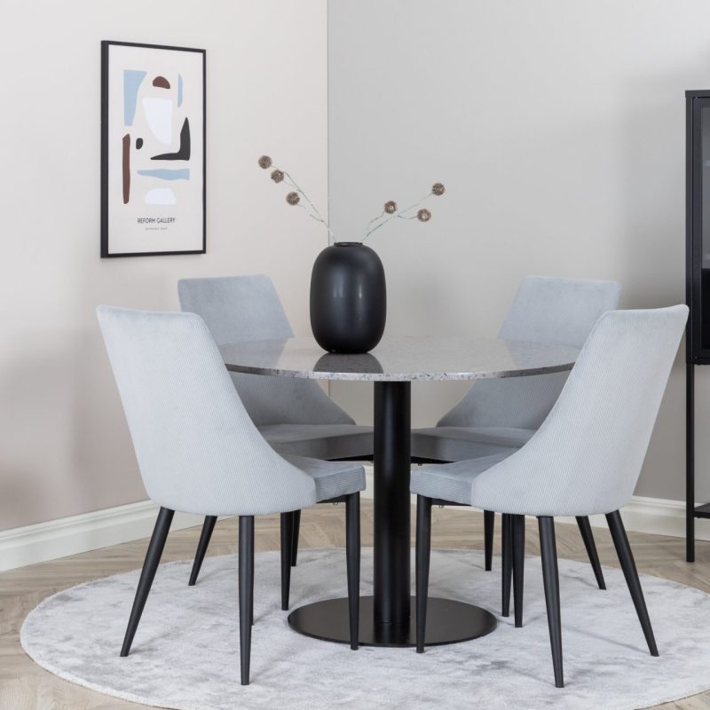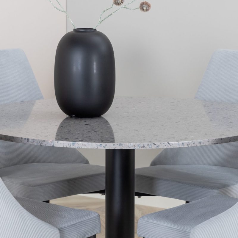 Tutvustame Razzia söögilauda ja Leone söögitoolide komplekti – täiuslik segu modernsusest ja stiilist teie kodus. 106 cm läbimõõduga Razzia söögilaud on kaetud stiilse halli Terazzo plaadiga ning mustade jalgadega. Kombineeritud helehalli sametkattega Leone söögitooliga, millel on mustad jalad, on see komplekt šikk lisand igasse söögiruumi.