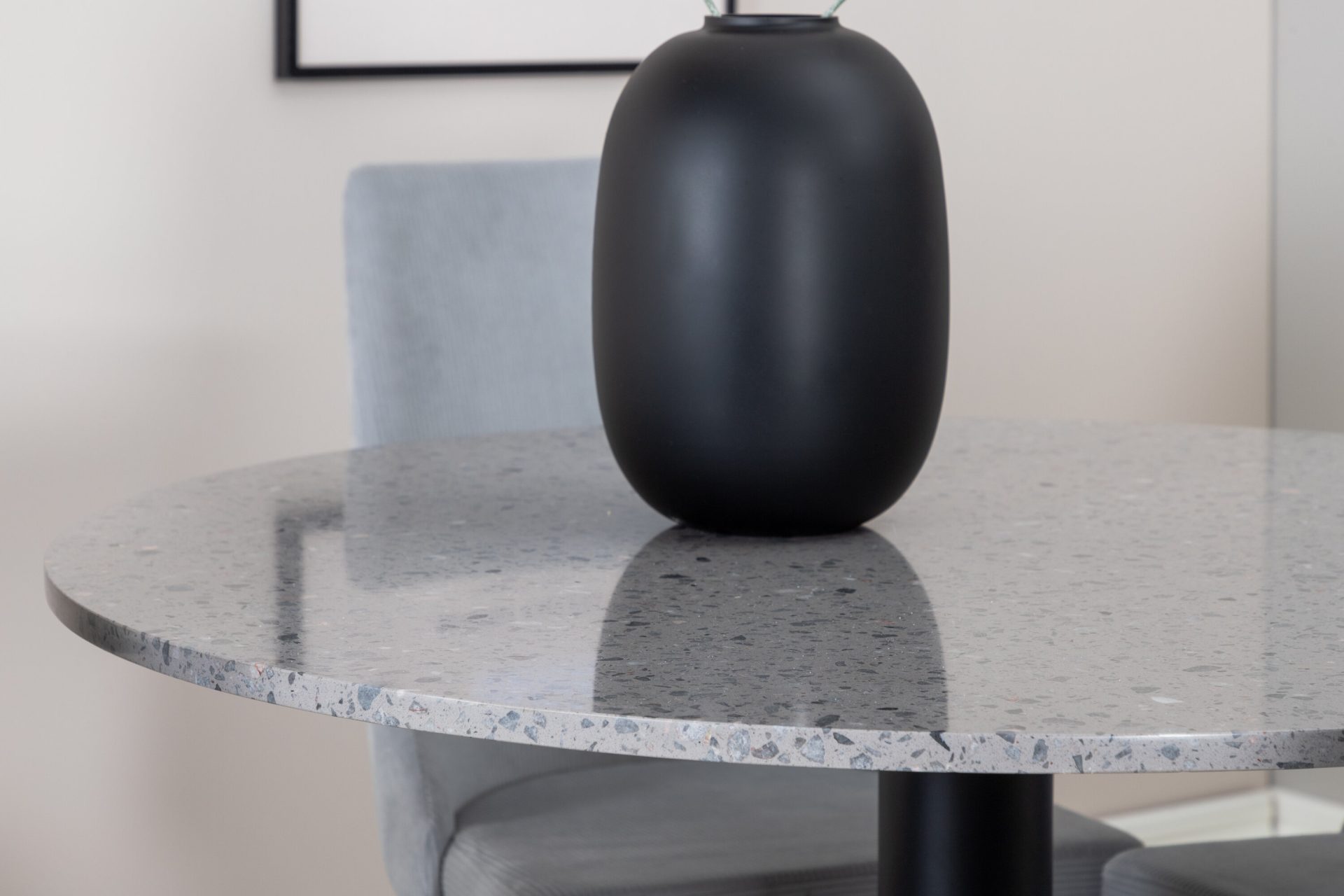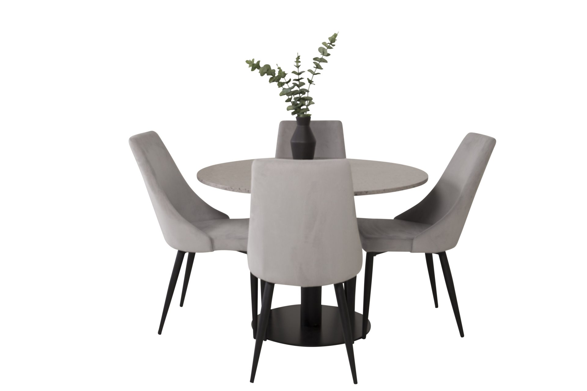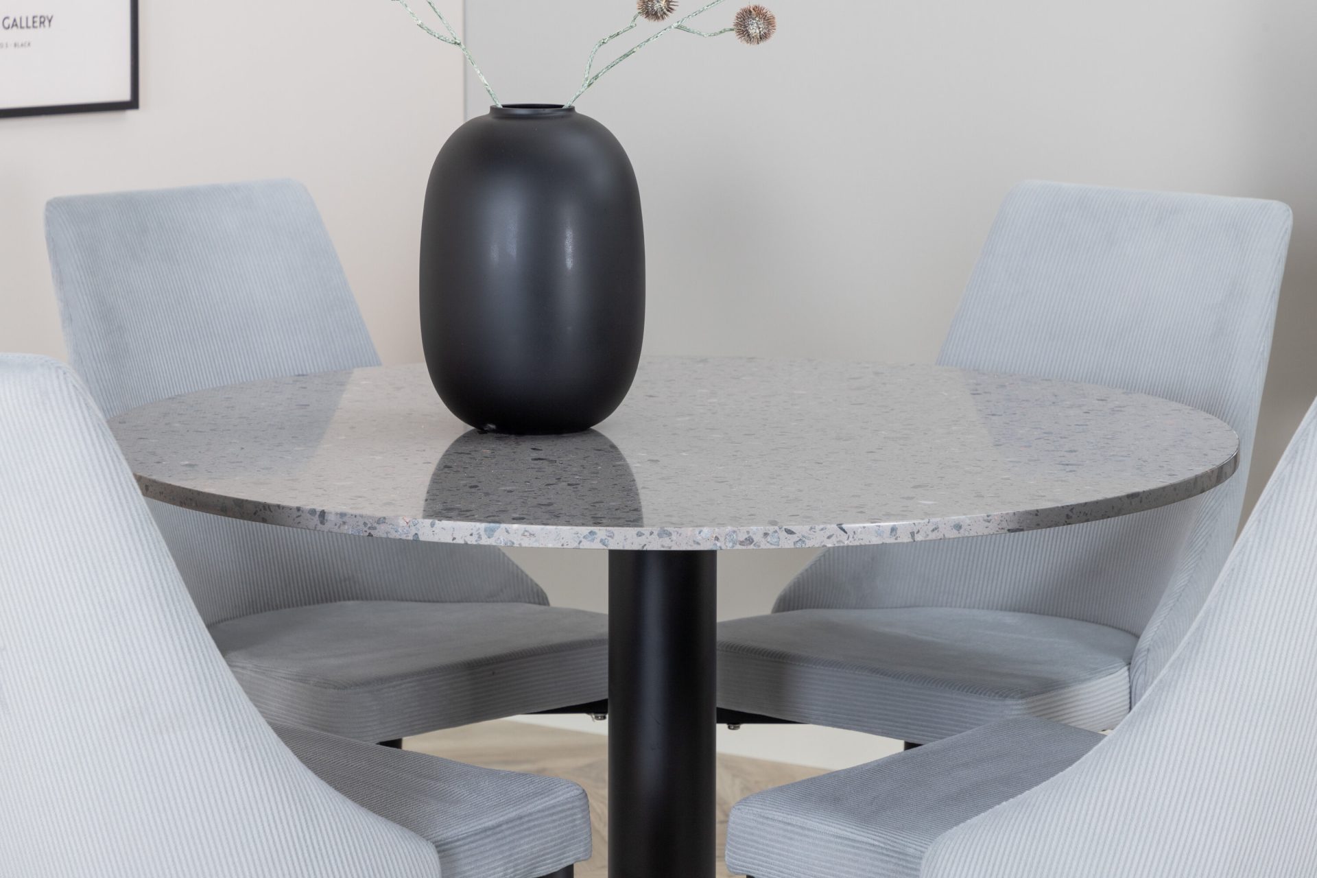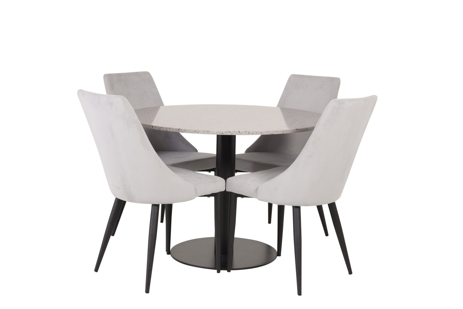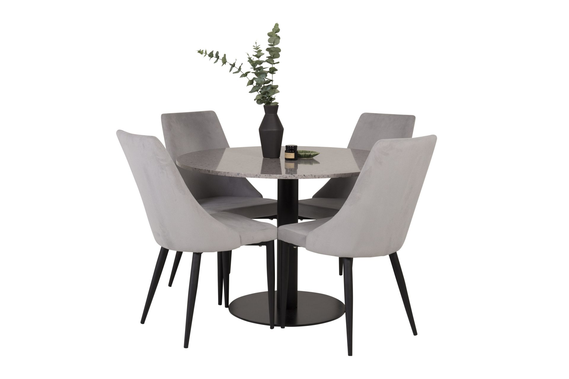 Tutvustame Razzia söögilauda ja Leone söögitoolide komplekti – täiuslik segu modernsusest ja stiilist teie kodus. 106 cm läbimõõduga Razzia söögilaud on kaetud stiilse halli Terazzo plaadiga ning mustade jalgadega. Kombineeritud helehalli sametkattega Leone söögitooliga, millel on mustad jalad, on see komplekt šikk lisand igasse söögiruumi.