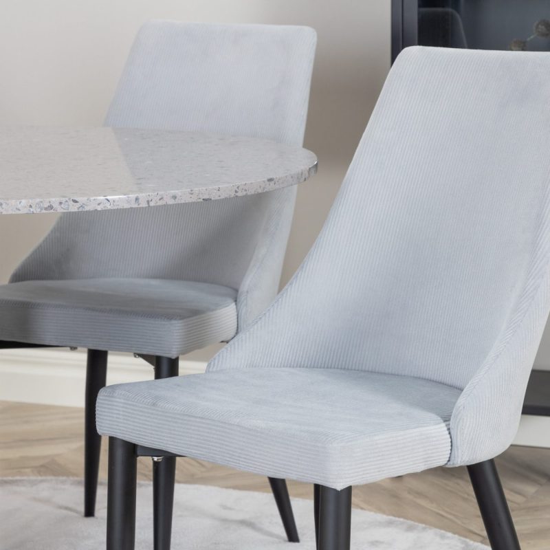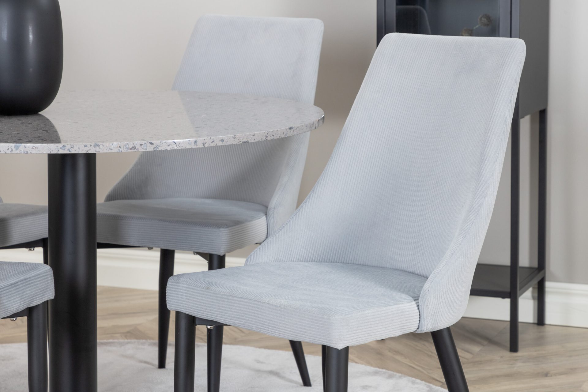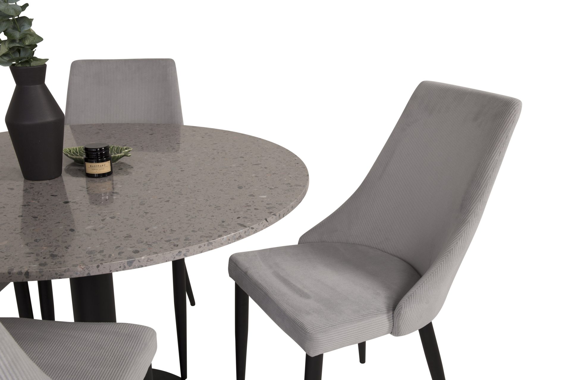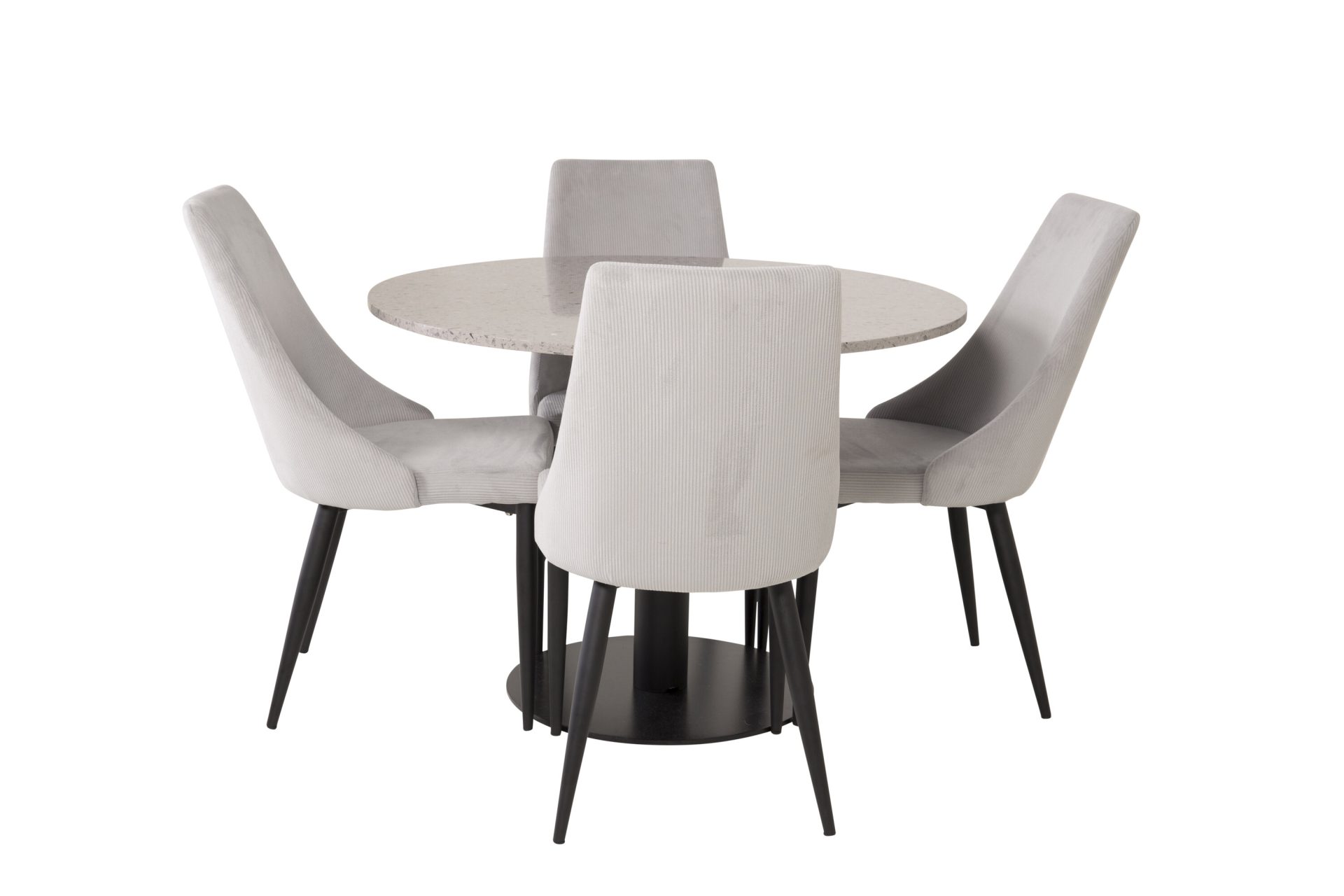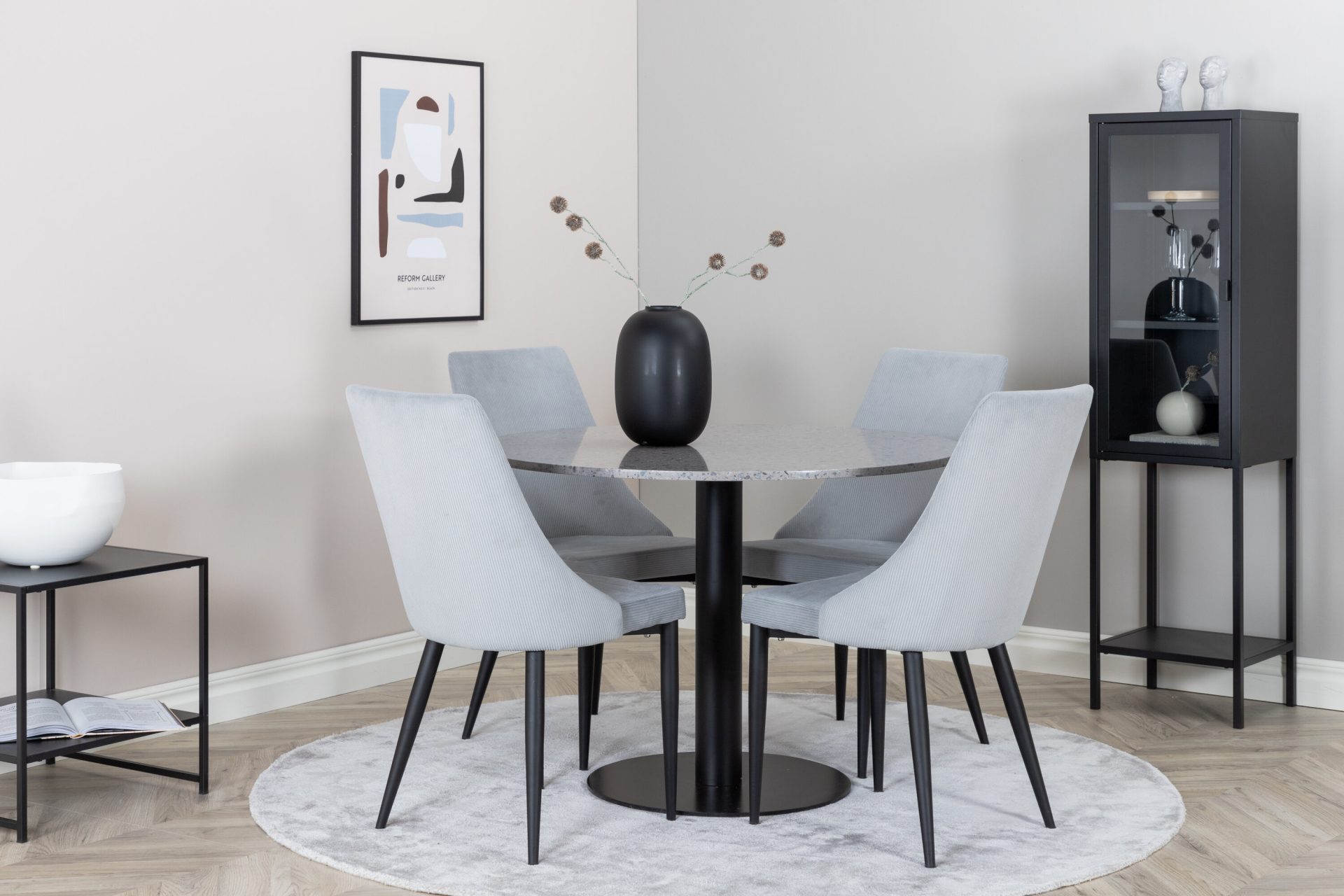 Tutvustame Razzia söögilauda ja Leone söögitoolide komplekti – täiuslik segu modernsusest ja stiilist teie kodus. 106 cm läbimõõduga Razzia söögilaud on kaetud stiilse halli Terazzo plaadiga ning mustade jalgadega. Kombineeritud helehalli sametkattega Leone söögitooliga, millel on mustad jalad, on see komplekt šikk lisand igasse söögiruumi.