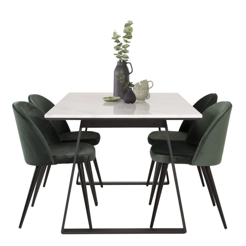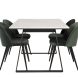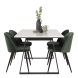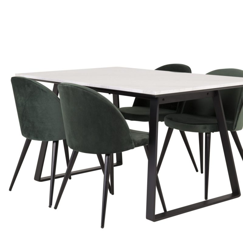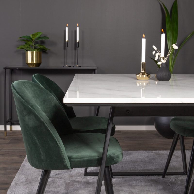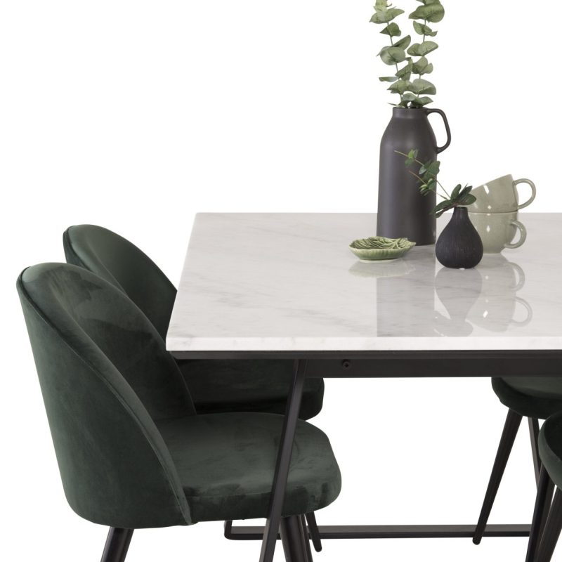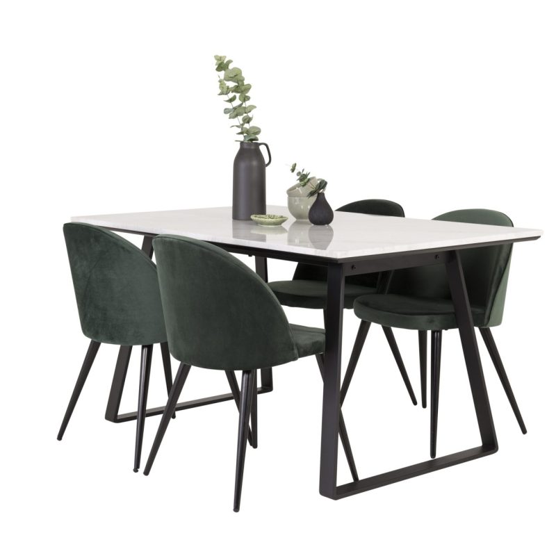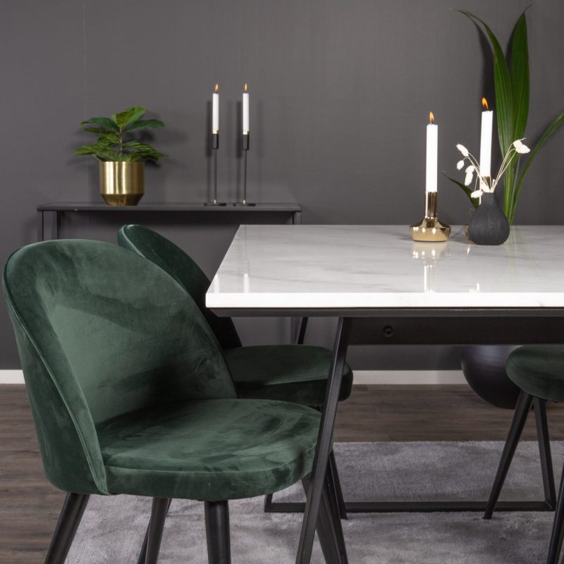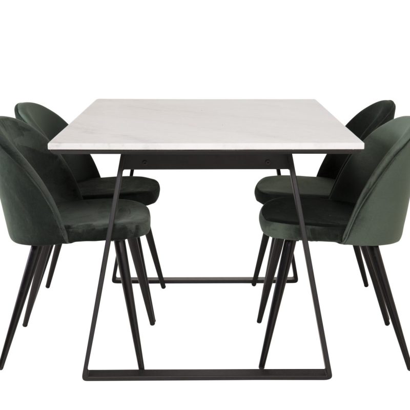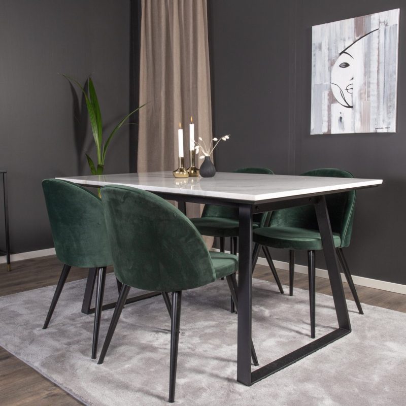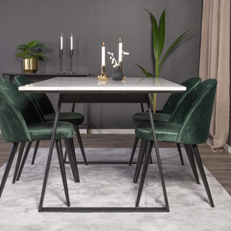 Tutvustame Estelle söögitoa komplekti – täiuslik segu elegantsusest ja modernsusest teie koju. Söögilaud on kaetud sileda valge marmorplaadiga ning mustade jalgadega, mis on täiendatud pehmete rohelise sametiga söögitoolidega, millel on samuti mustad jalad. Kõrgkvaliteetsetest materjalidest, sealhulgas painutatud puidust, vahtplastist, marmorist ja terasest valmistatud komplekt on loodud teie söögitoas hubase ja stiilse õhkkonna loomiseks.