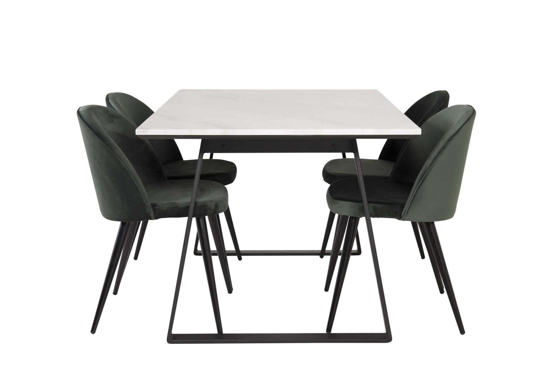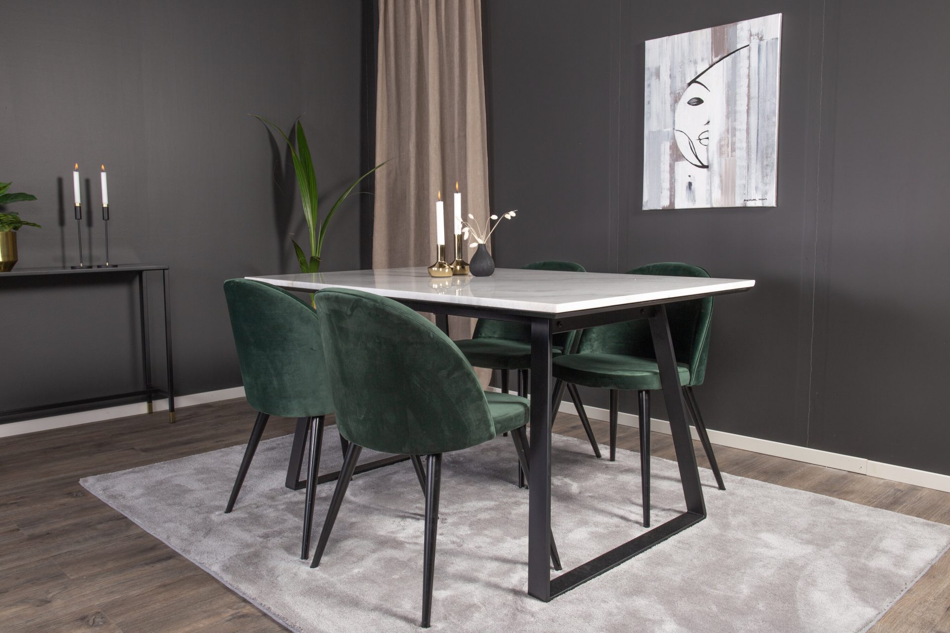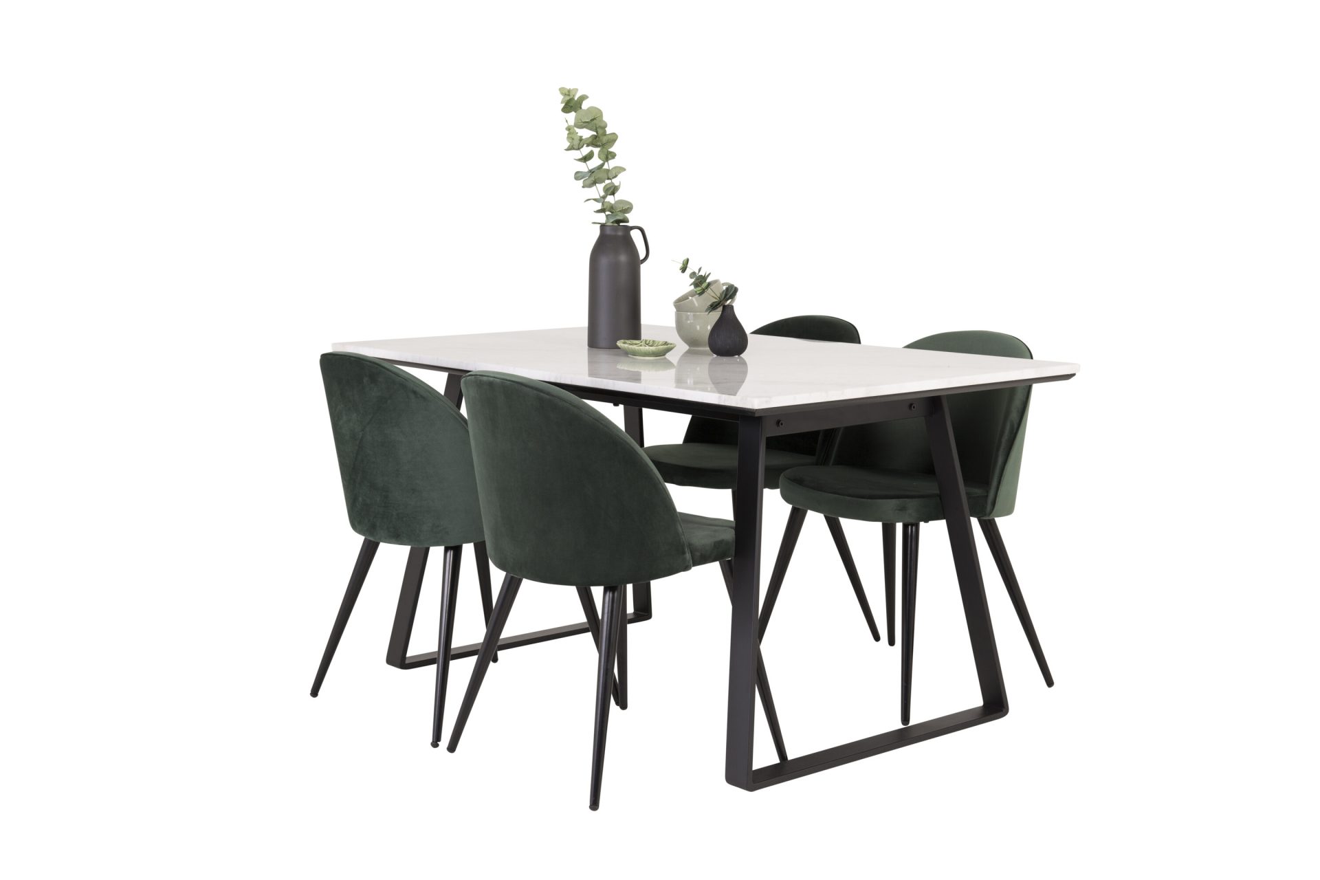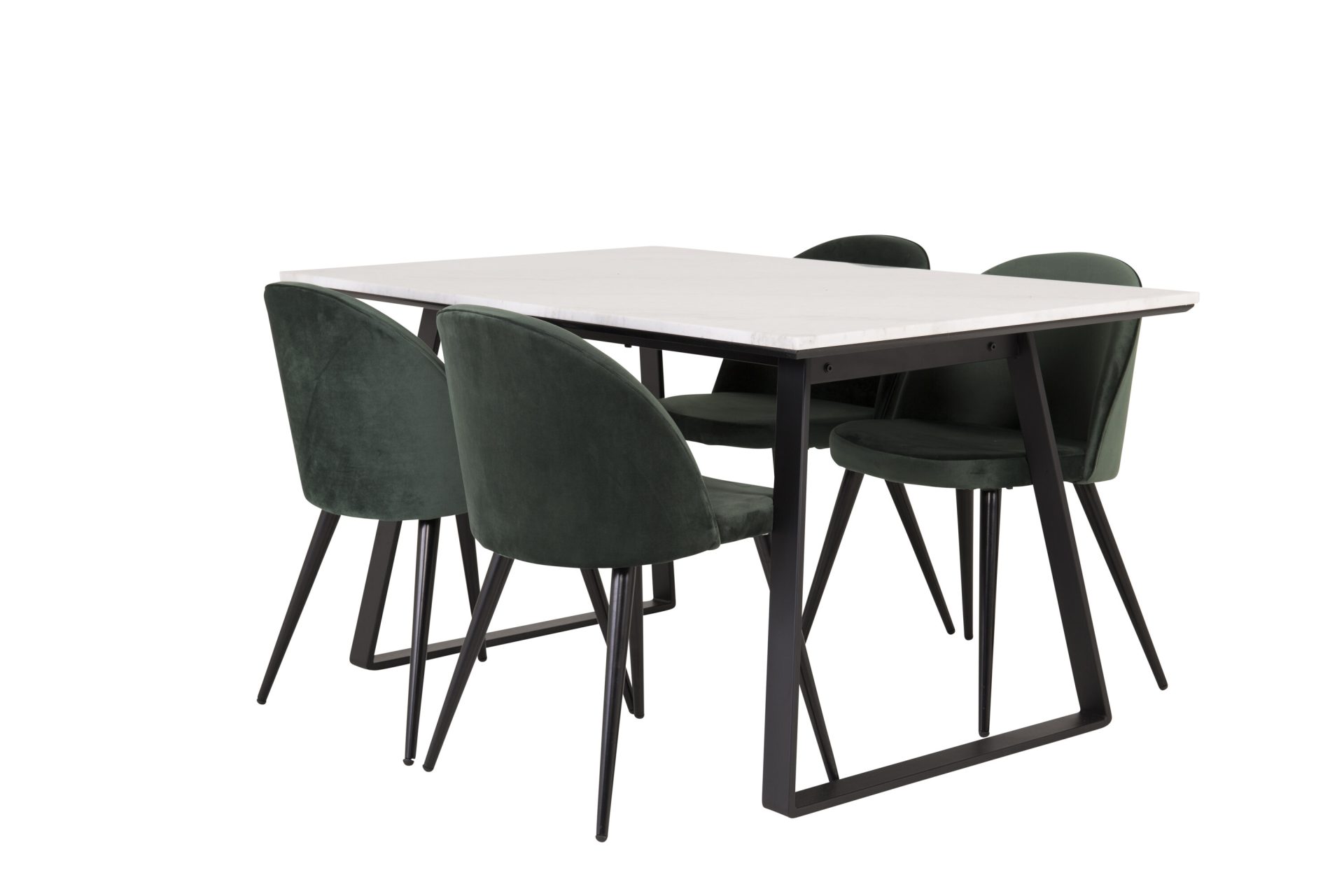 Tutvustame Estelle söögitoa komplekti – täiuslik segu elegantsusest ja modernsusest teie koju. Söögilaud on kaetud sileda valge marmorplaadiga ning mustade jalgadega, mis on täiendatud pehmete rohelise sametiga söögitoolidega, millel on samuti mustad jalad. Kõrgkvaliteetsetest materjalidest, sealhulgas painutatud puidust, vahtplastist, marmorist ja terasest valmistatud komplekt on loodud teie söögitoas hubase ja stiilse õhkkonna loomiseks.