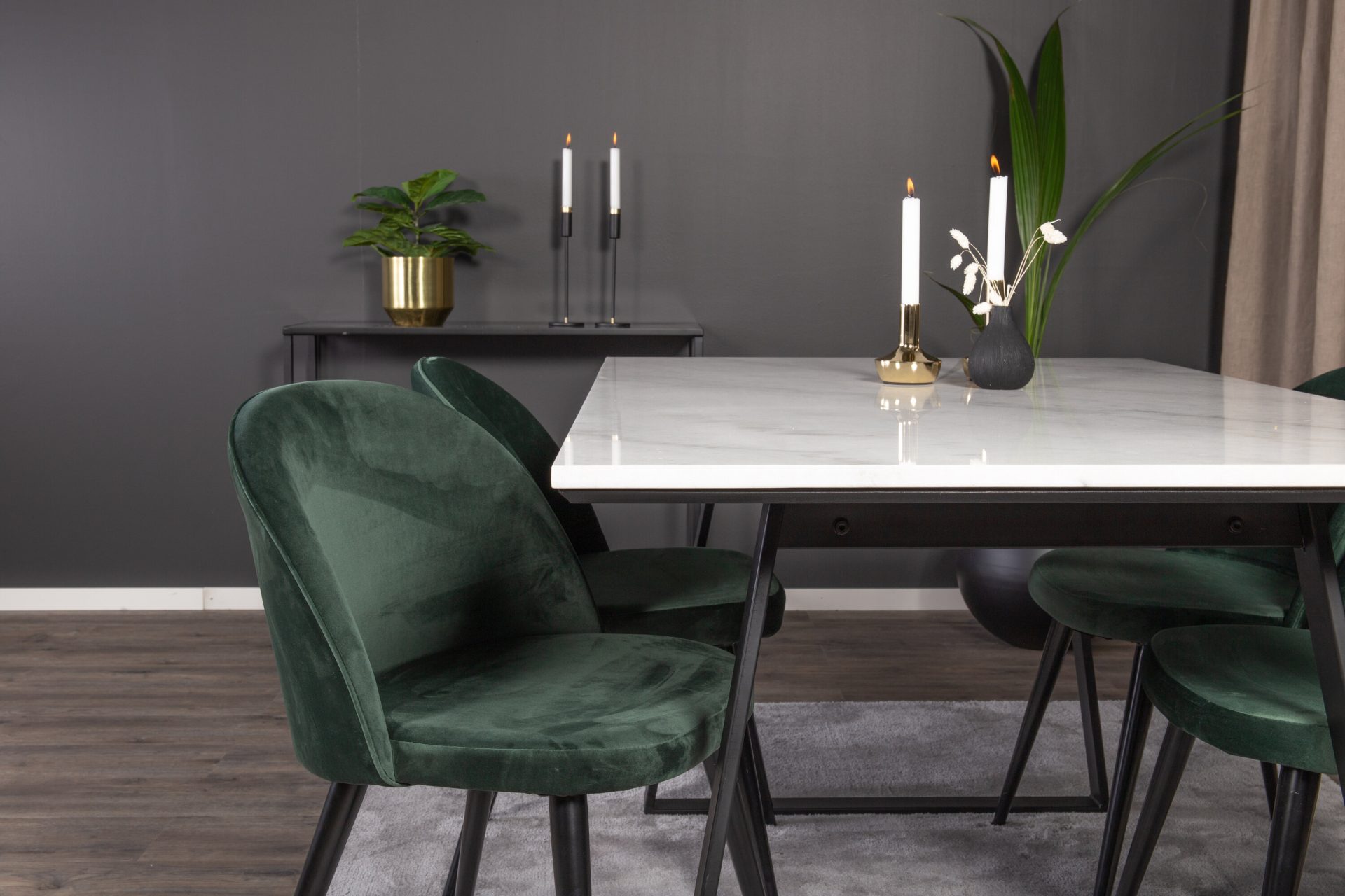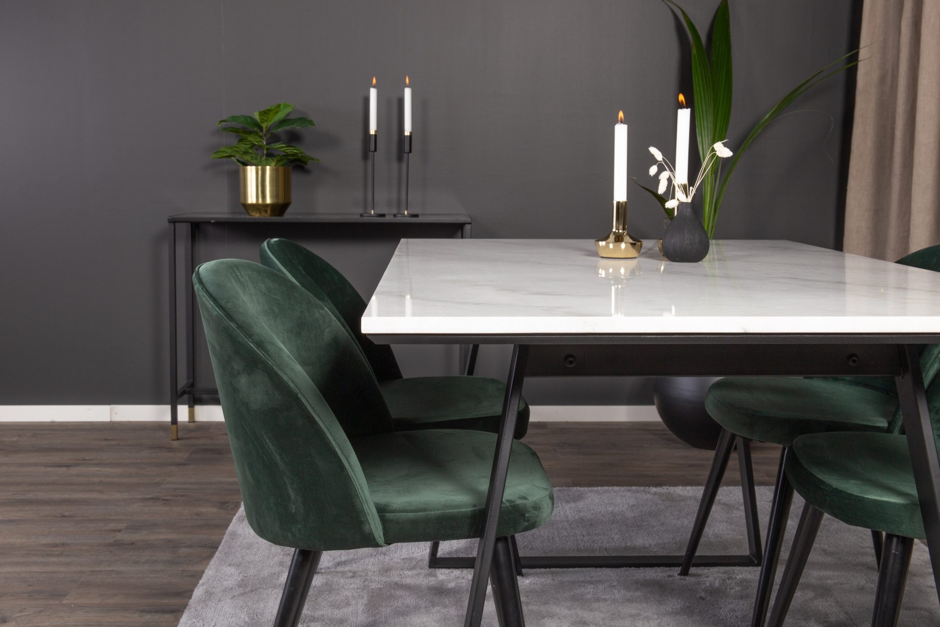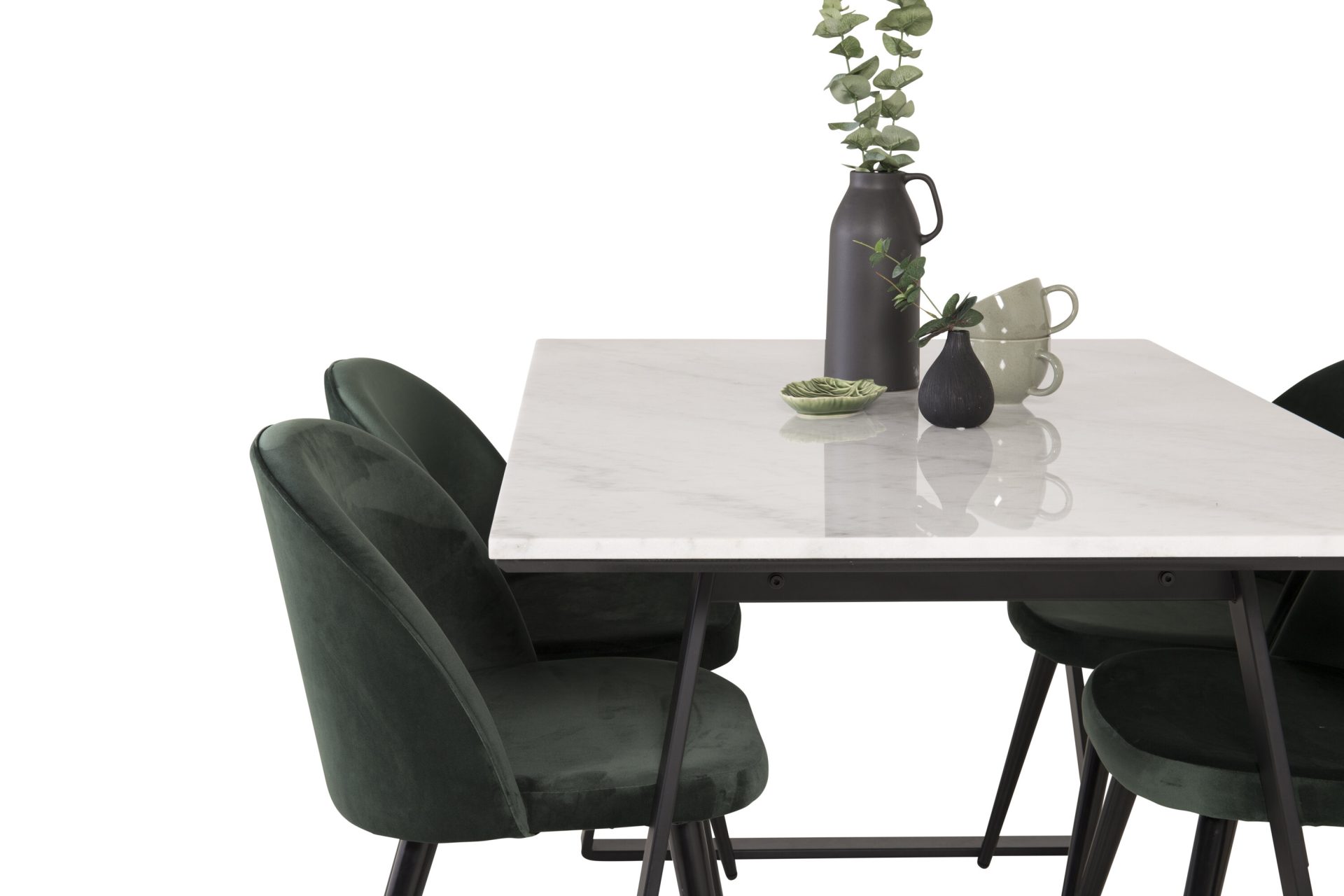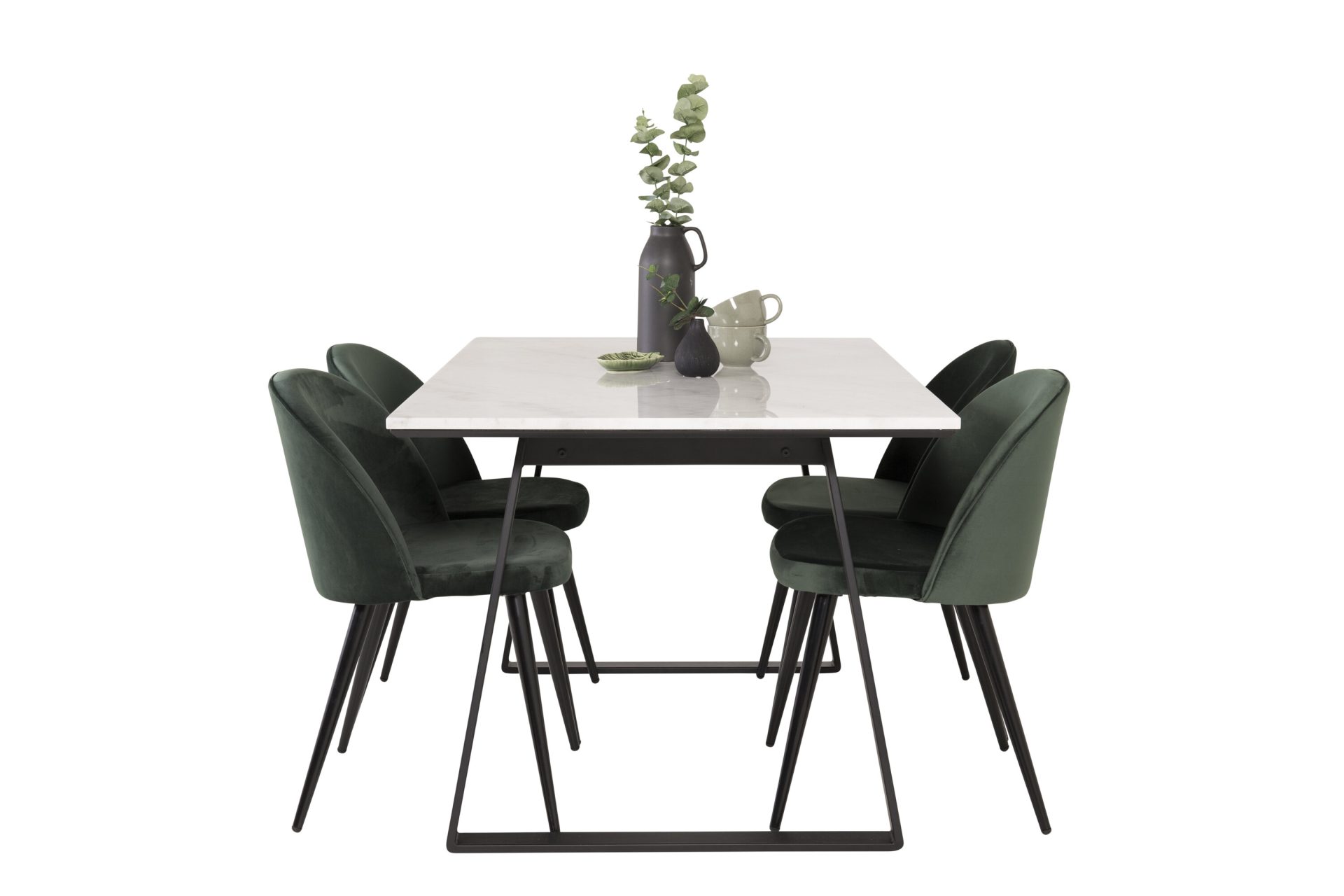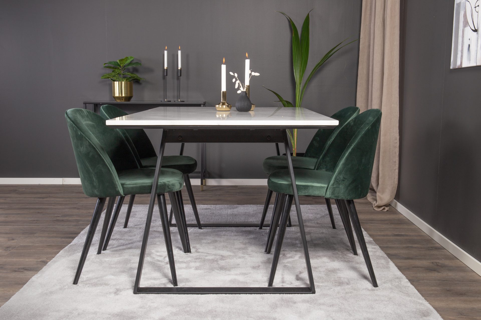 Tutvustame Estelle söögitoa komplekti – täiuslik segu elegantsusest ja modernsusest teie koju. Söögilaud on kaetud sileda valge marmorplaadiga ning mustade jalgadega, mis on täiendatud pehmete rohelise sametiga söögitoolidega, millel on samuti mustad jalad. Kõrgkvaliteetsetest materjalidest, sealhulgas painutatud puidust, vahtplastist, marmorist ja terasest valmistatud komplekt on loodud teie söögitoas hubase ja stiilse õhkkonna loomiseks.