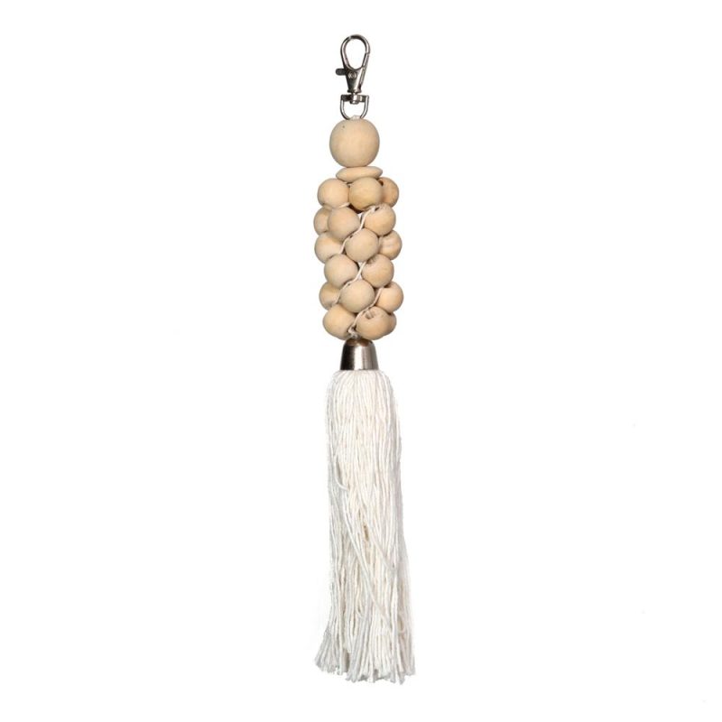 Puidust helmeste ja puuvillast tutiga võtmehoidja – boheemlaslik ja stiilne detail