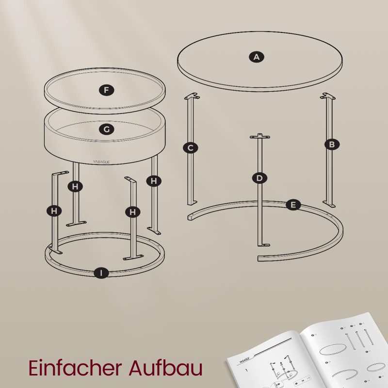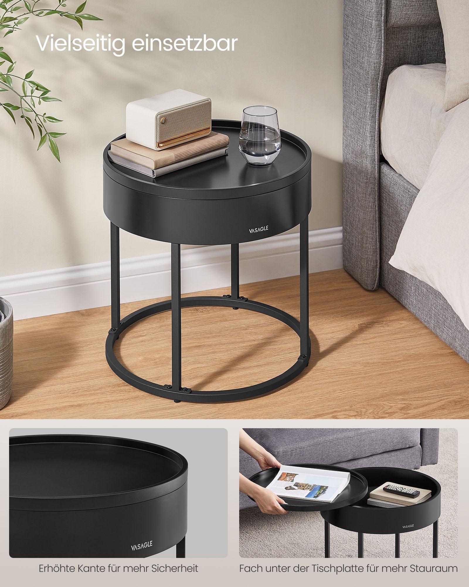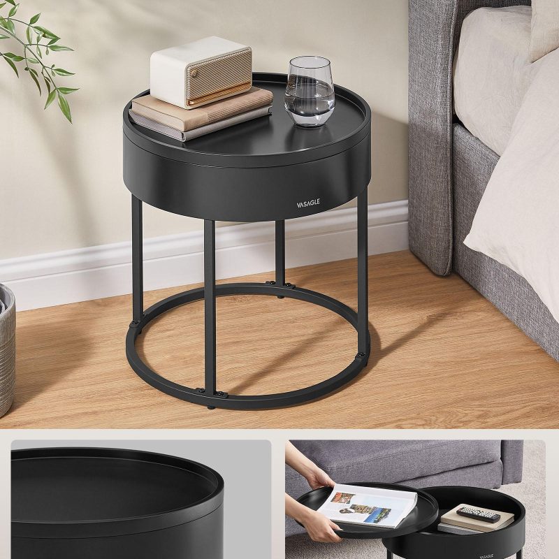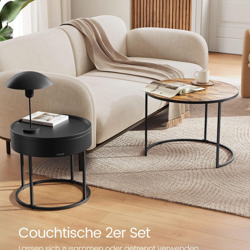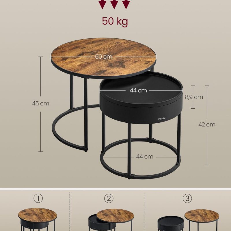 See stiilne ja mitmekülgne kohvilaudade komplekt sobib suurepäraselt elutuppa, magamistuppa või rõdule. Ümarate laudade disain sisaldab peidetud hoiuruumi, pakkudes praktilist lahendust igapäevaste esemete hoidmiseks. Vintagepruuni ja tintimusta viimistlusega lauad lisavad igale interjöörile kaasaegse, kuid sooja stiili.