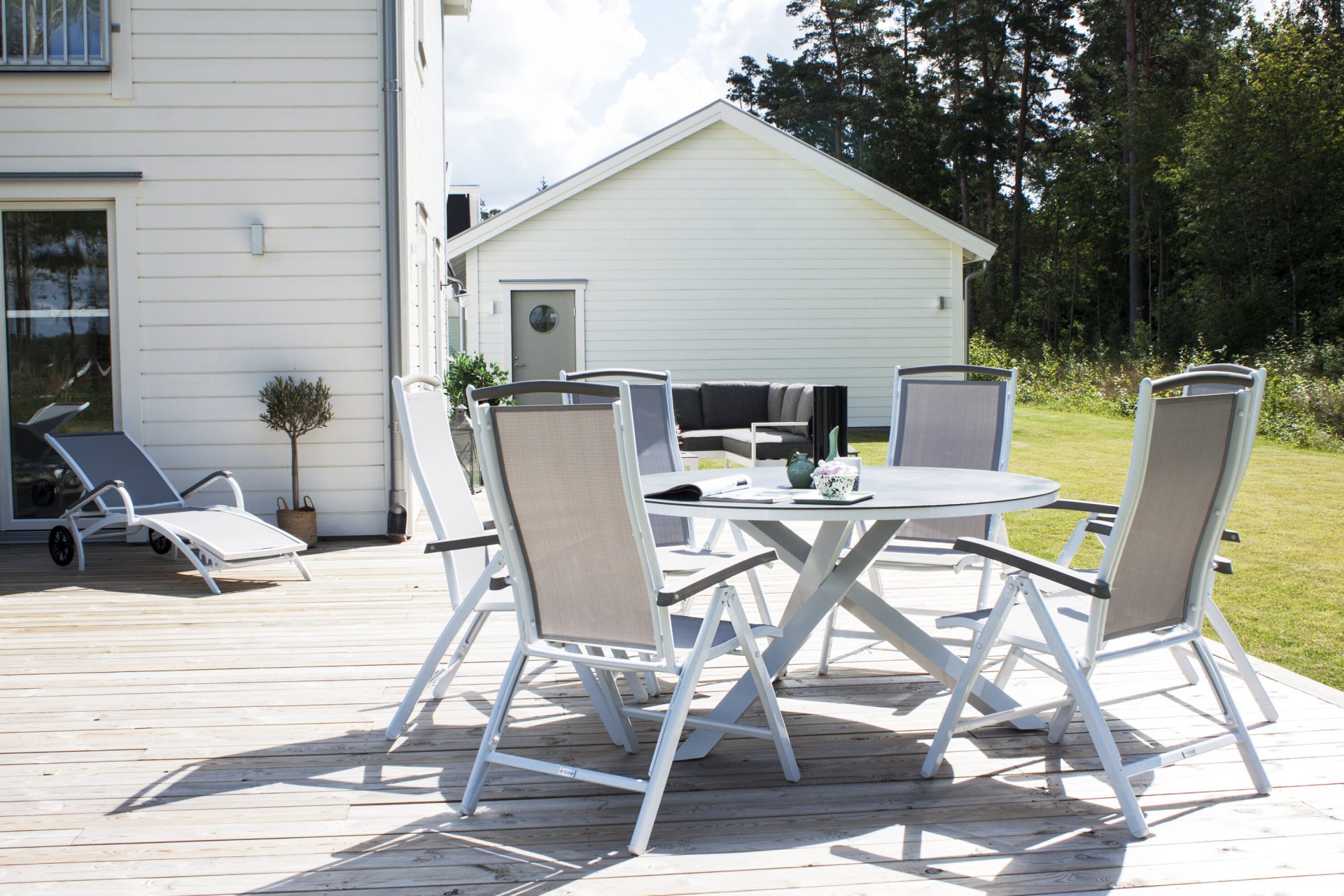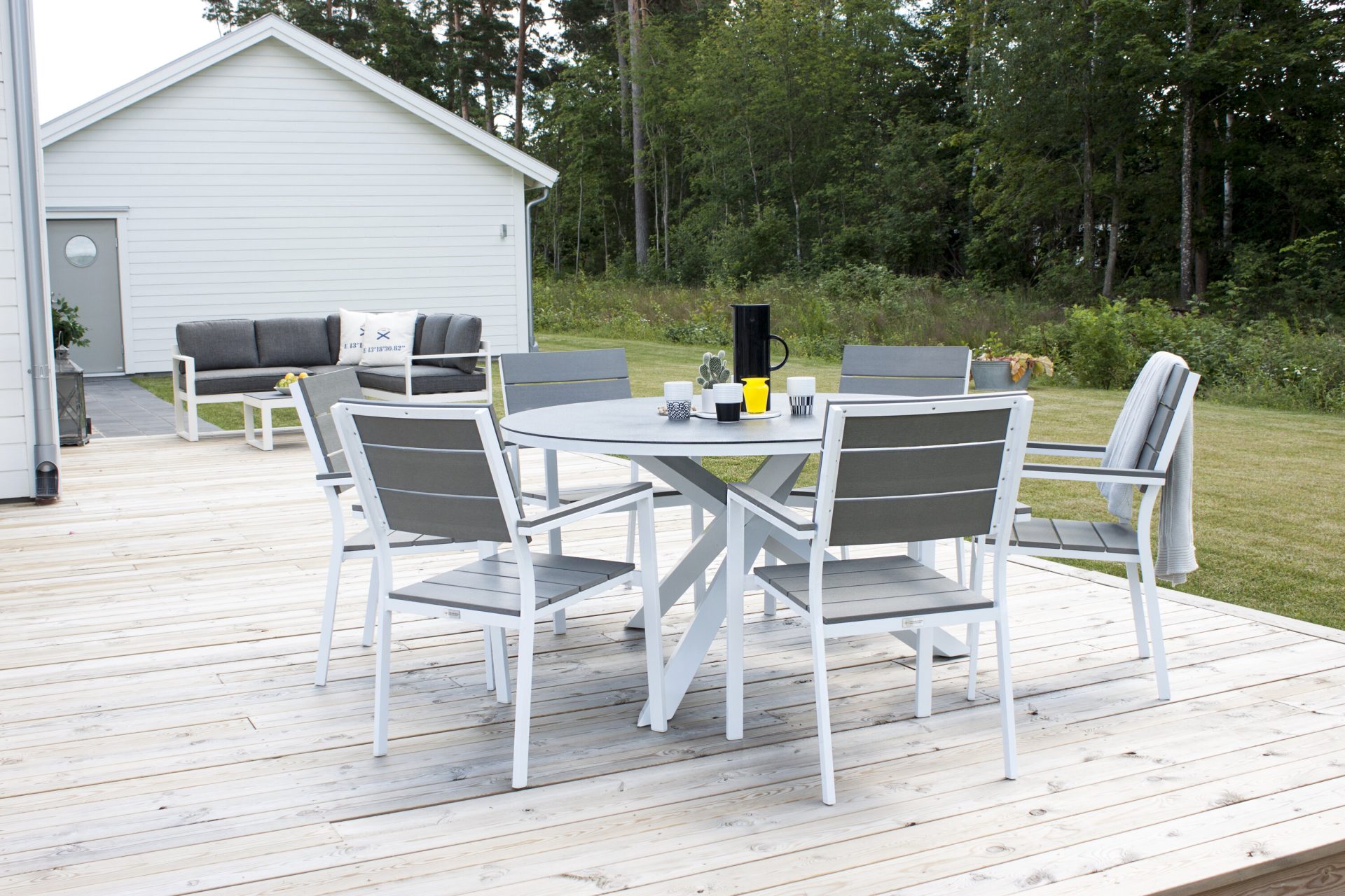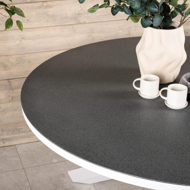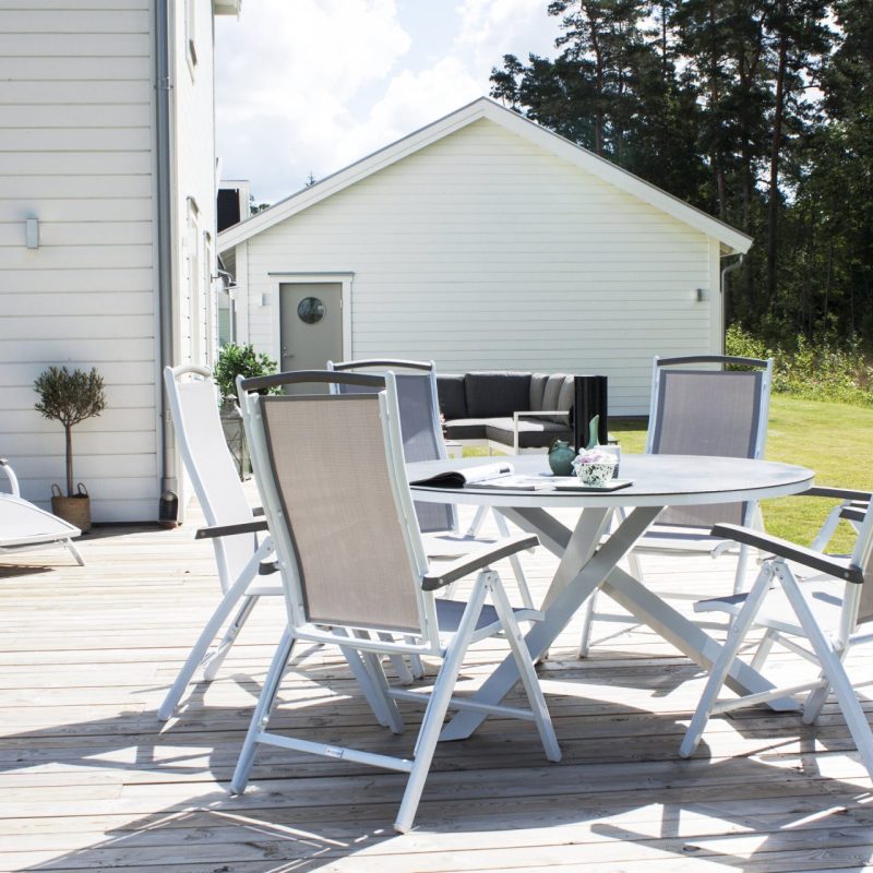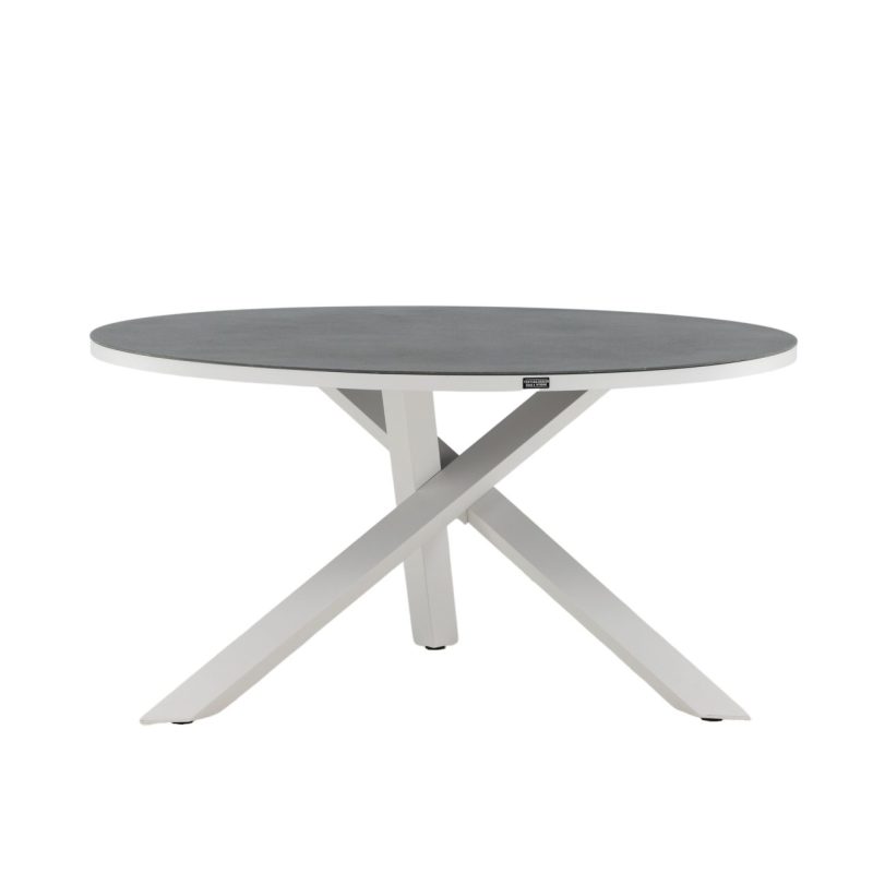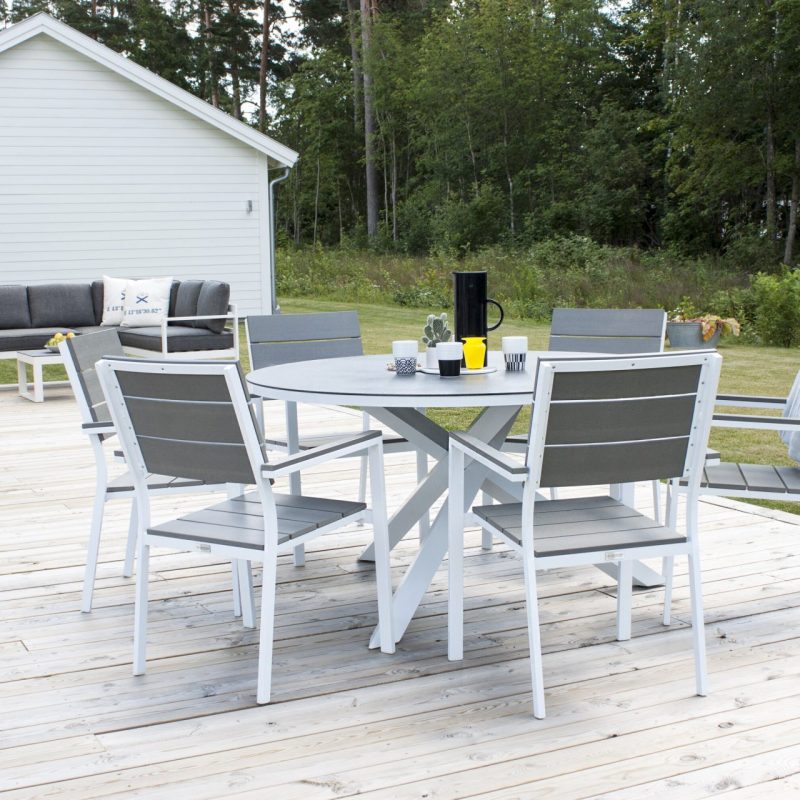 Tõsta oma terrassi tasemele Copacabana lauaga ø 140 valge/hall. See ümmargune söögilaud on klaasist pealispinnaga ja stiilse valge alumiiniumist alusraamiga, lisades stiili sinu õuealale. Paarita see söögitoolidega, et luua hubane koht, kus nautida suviseid toite lähedastega.